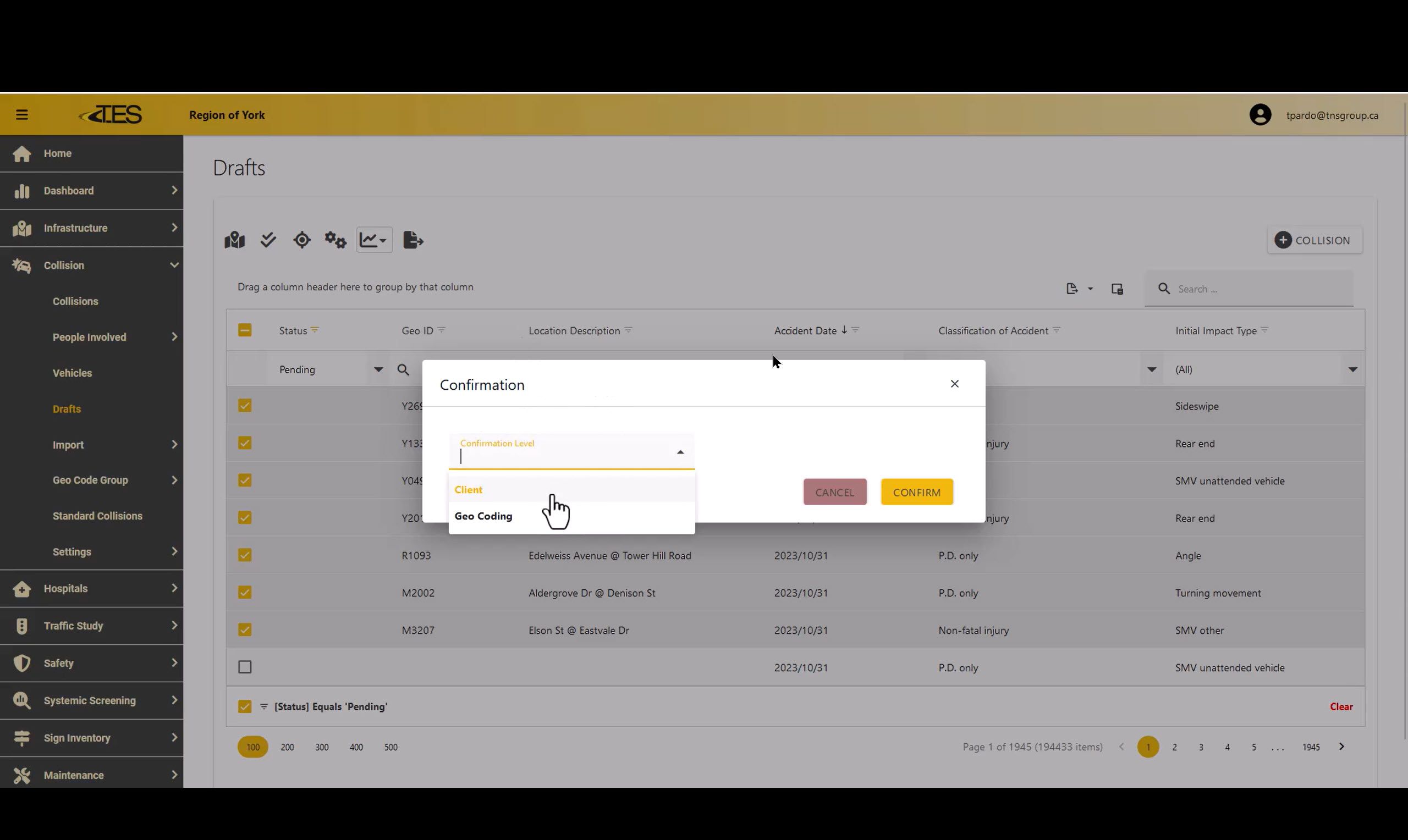 Geo Coding Confirmation : Restricts visibility to the geocoding team and administration - meaning the collisions are still not approved to be viewed by everyone in your jurisdiction.