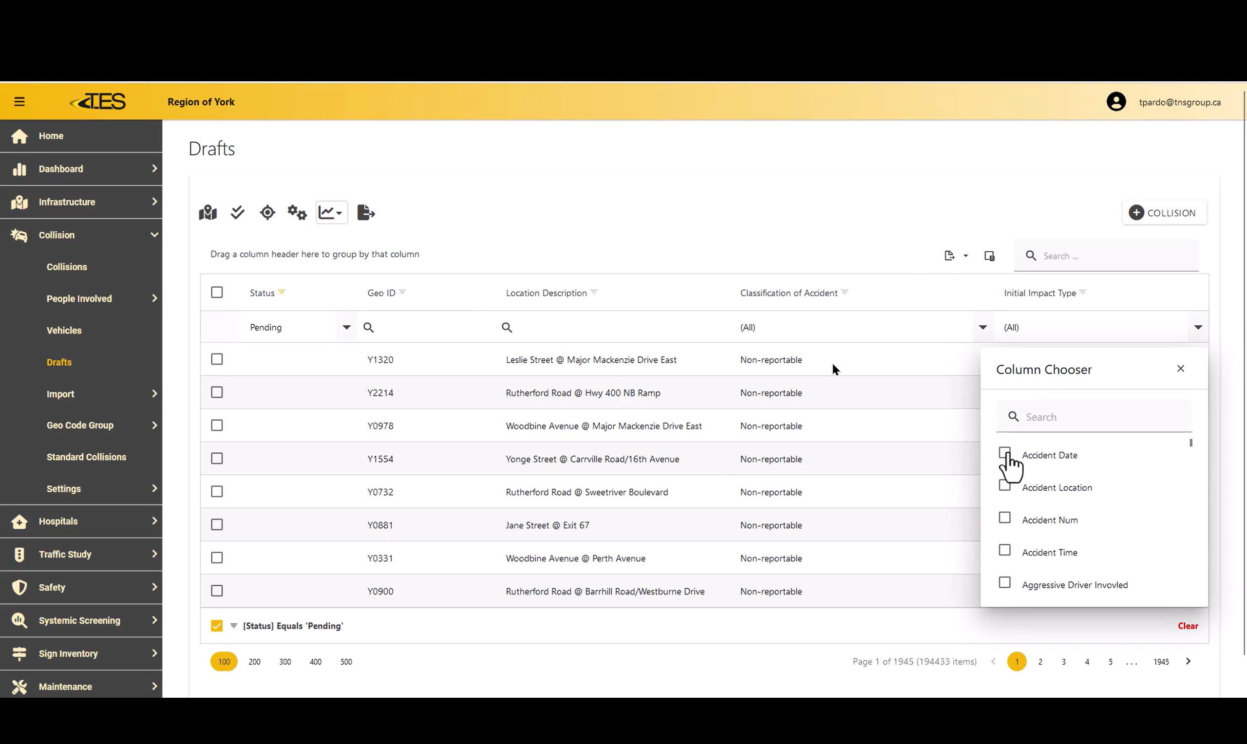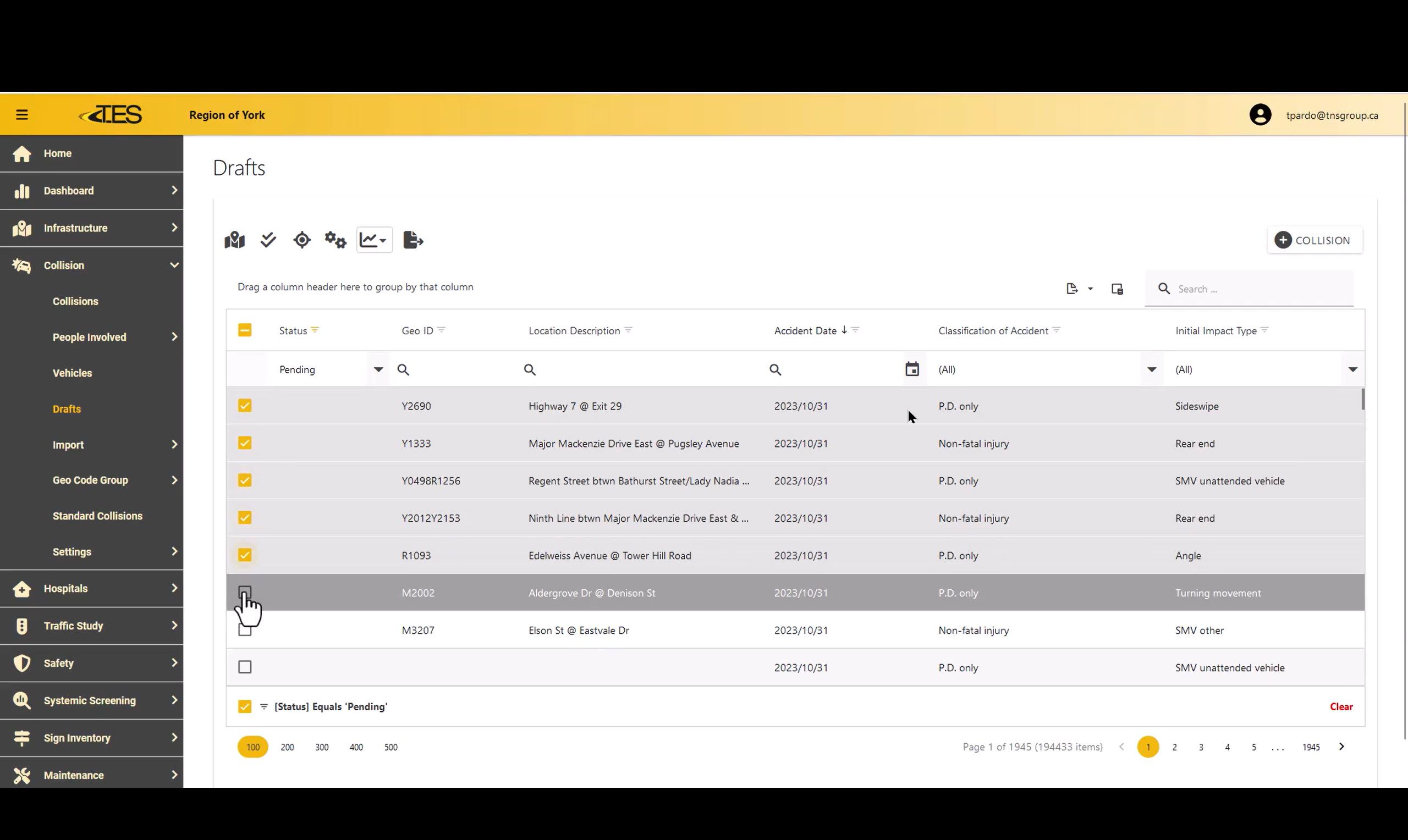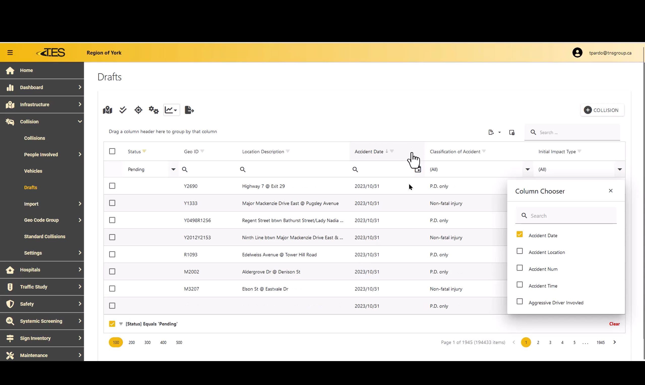 Displays a data grid containing all collisions in your jurisdiction with an additional column for collision status.