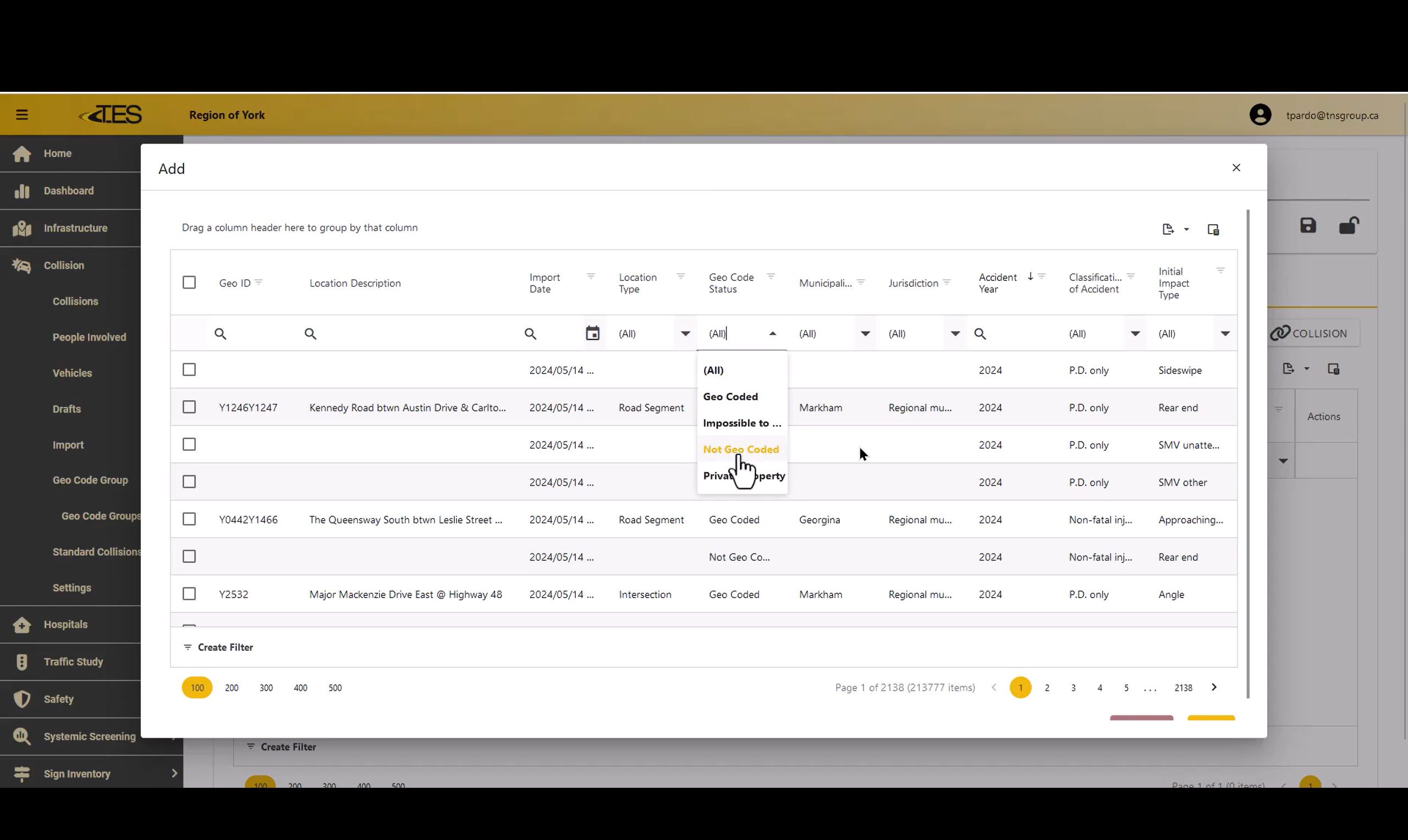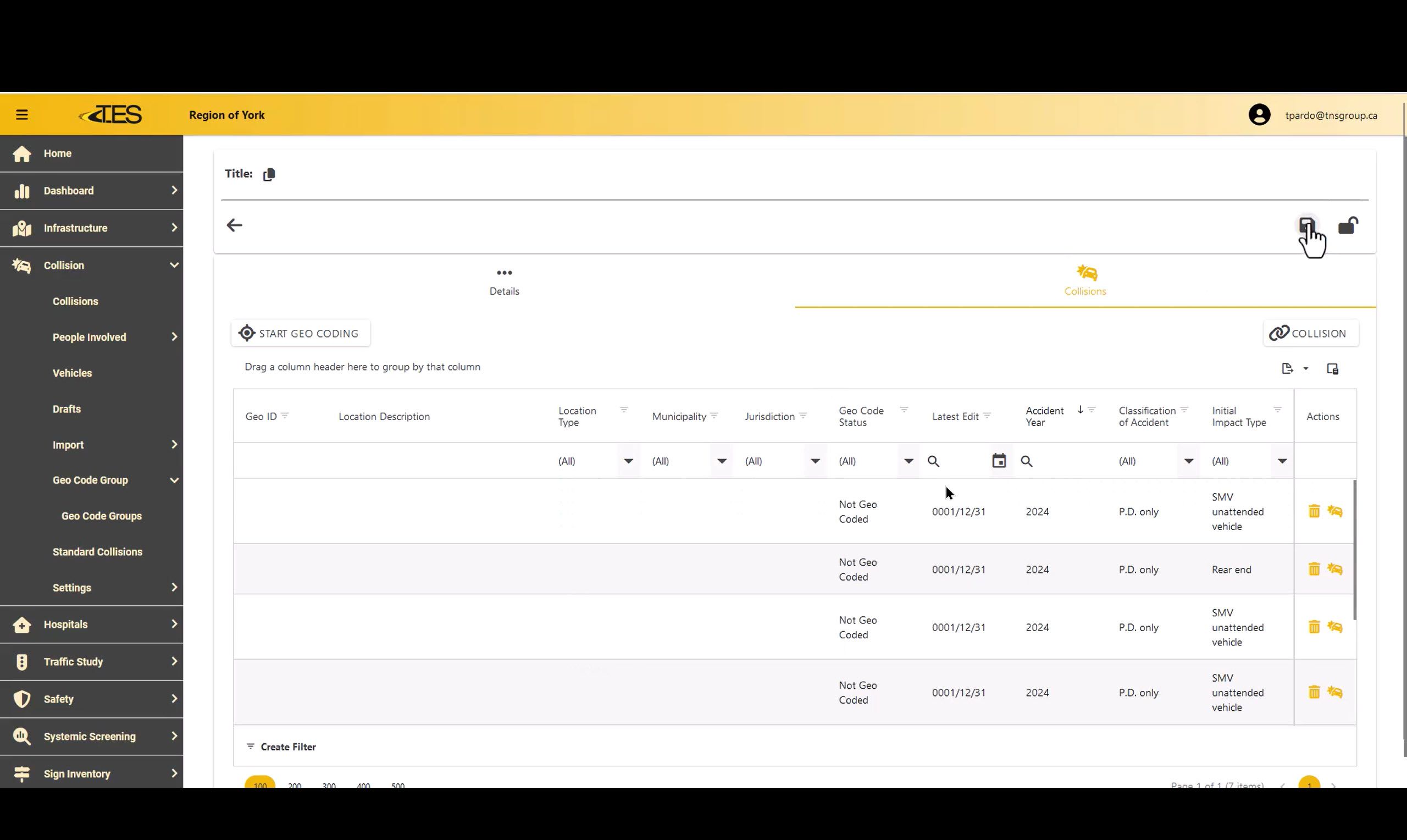 Apply a filter to the Geo Code Status column to show only collisions that are Not Geo Coded .