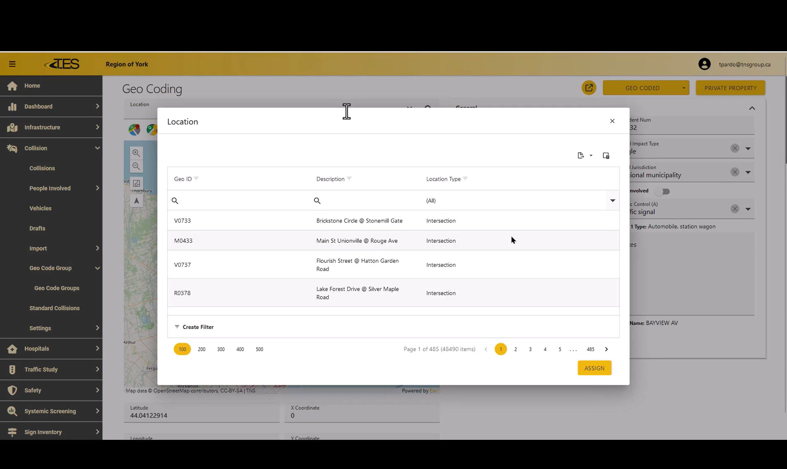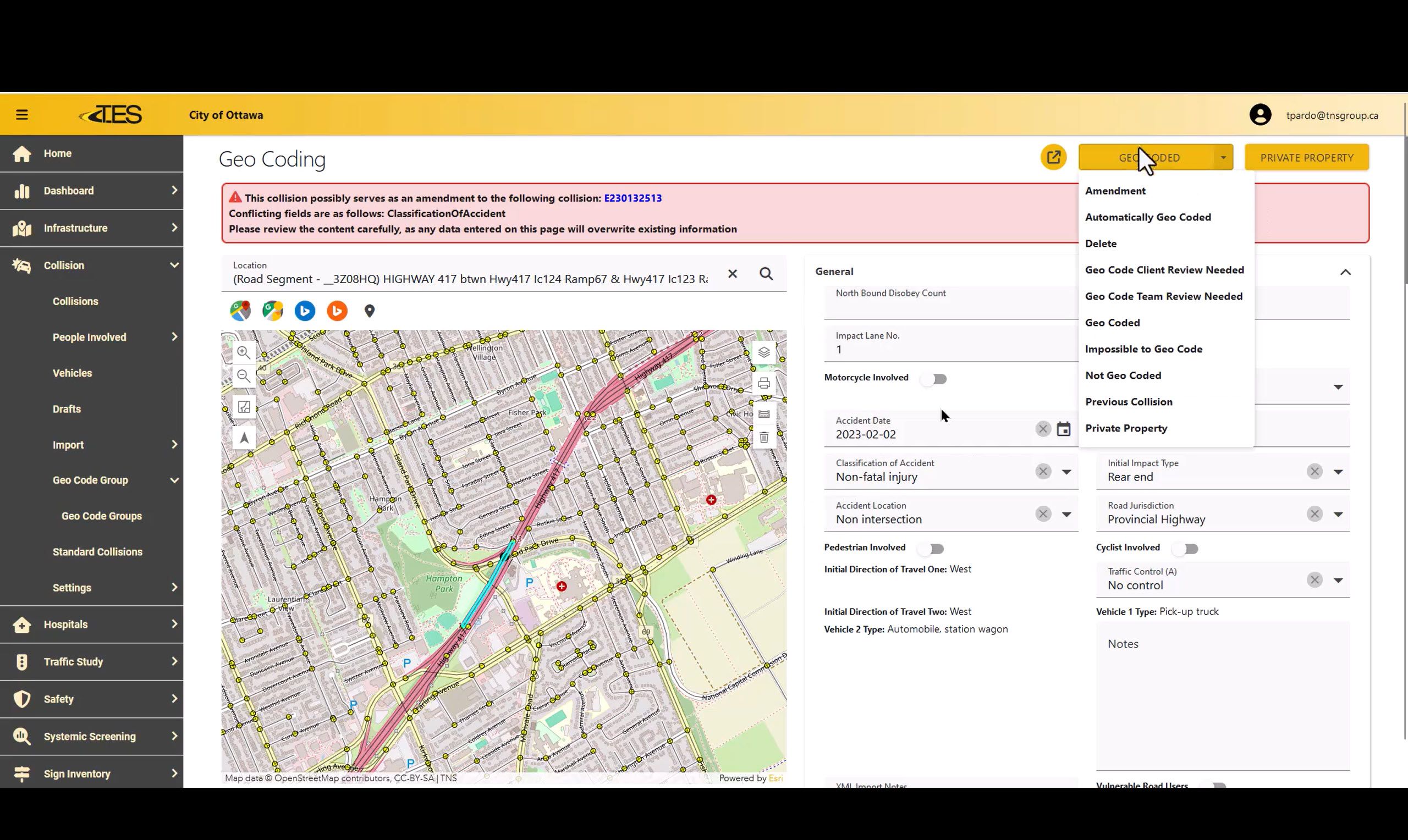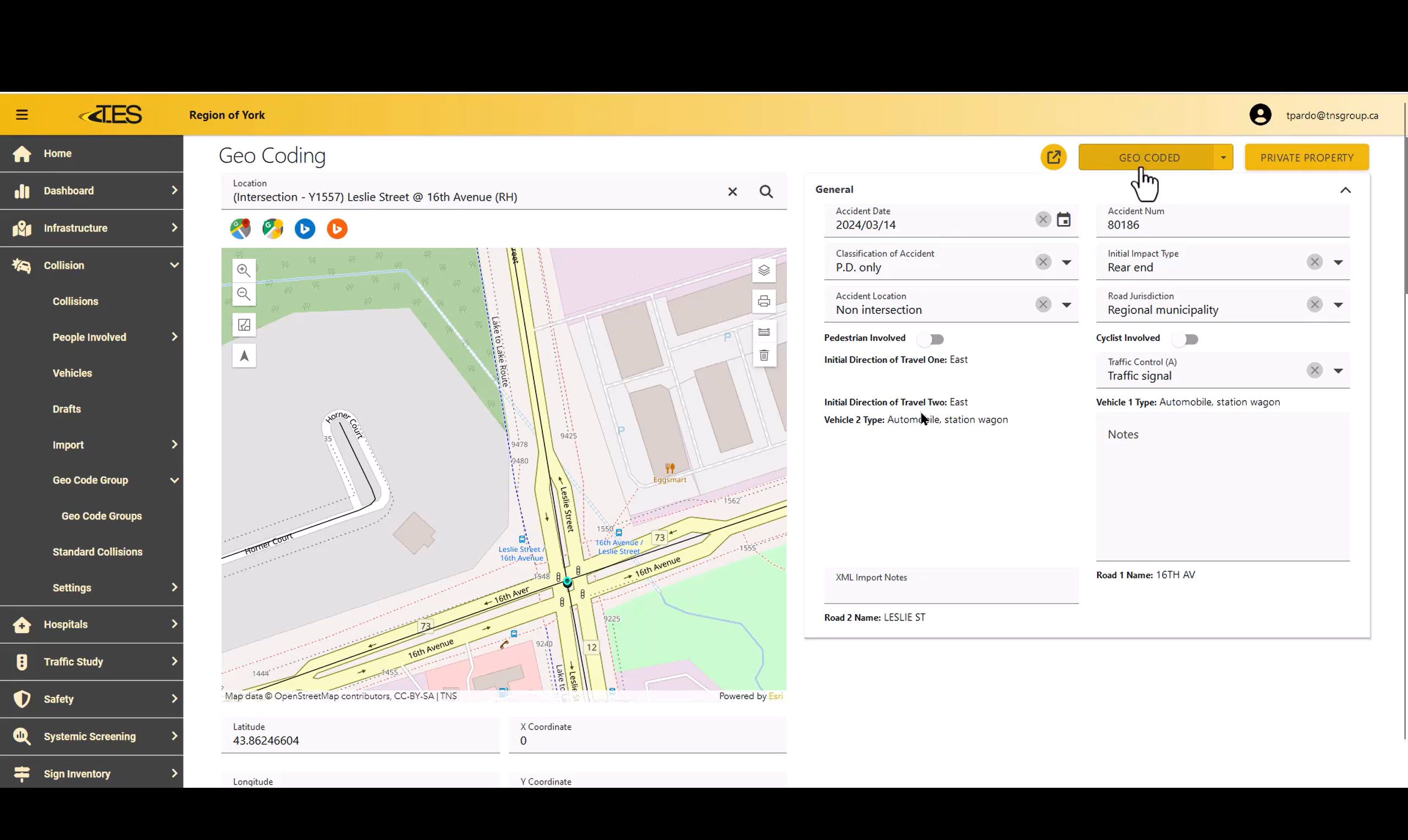 After assigning the correct location, click the Geocoded button to finalize geocoding for that collision.
