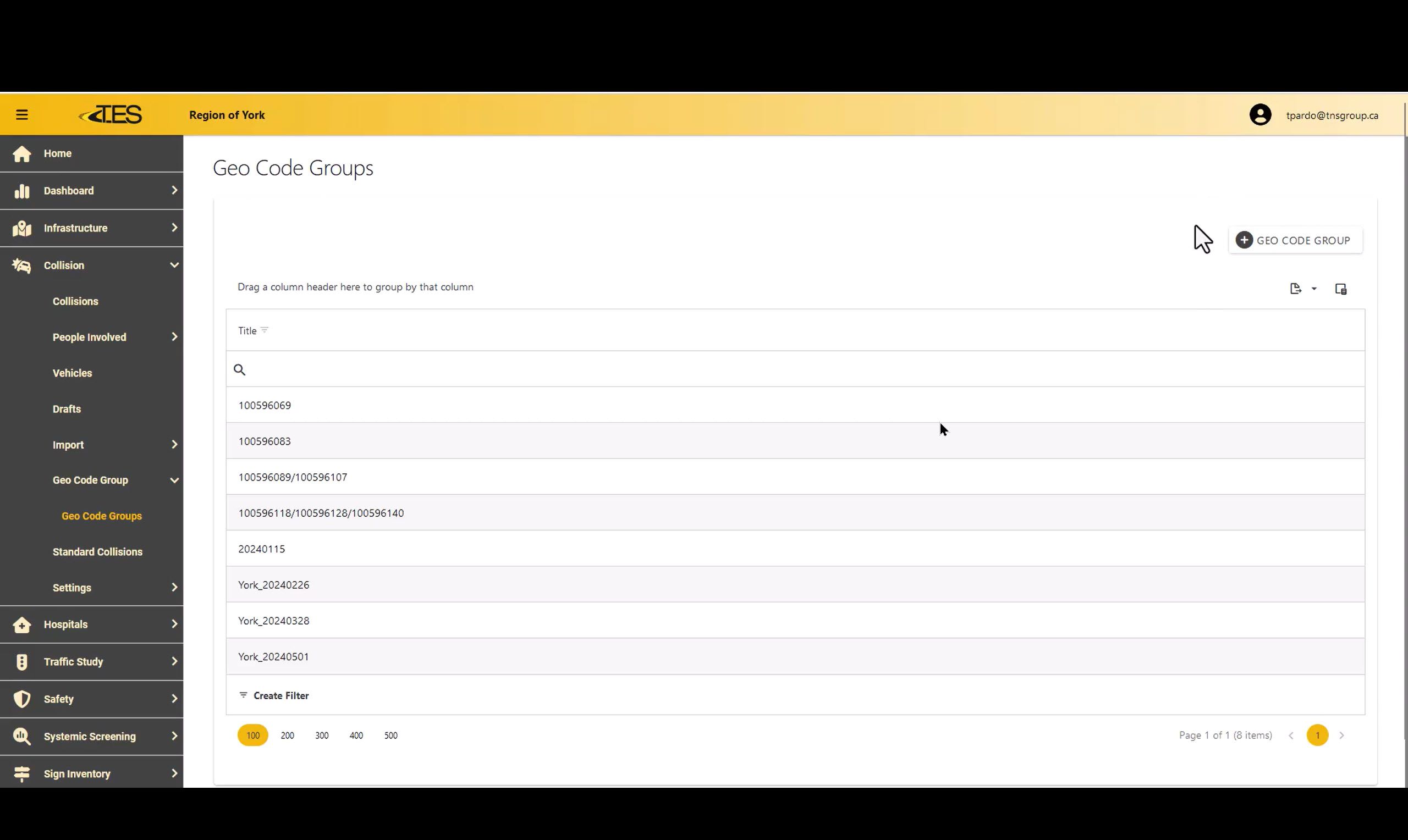 Go to the Geo Code Groups module under the Collision section in the TES Cloud menu.