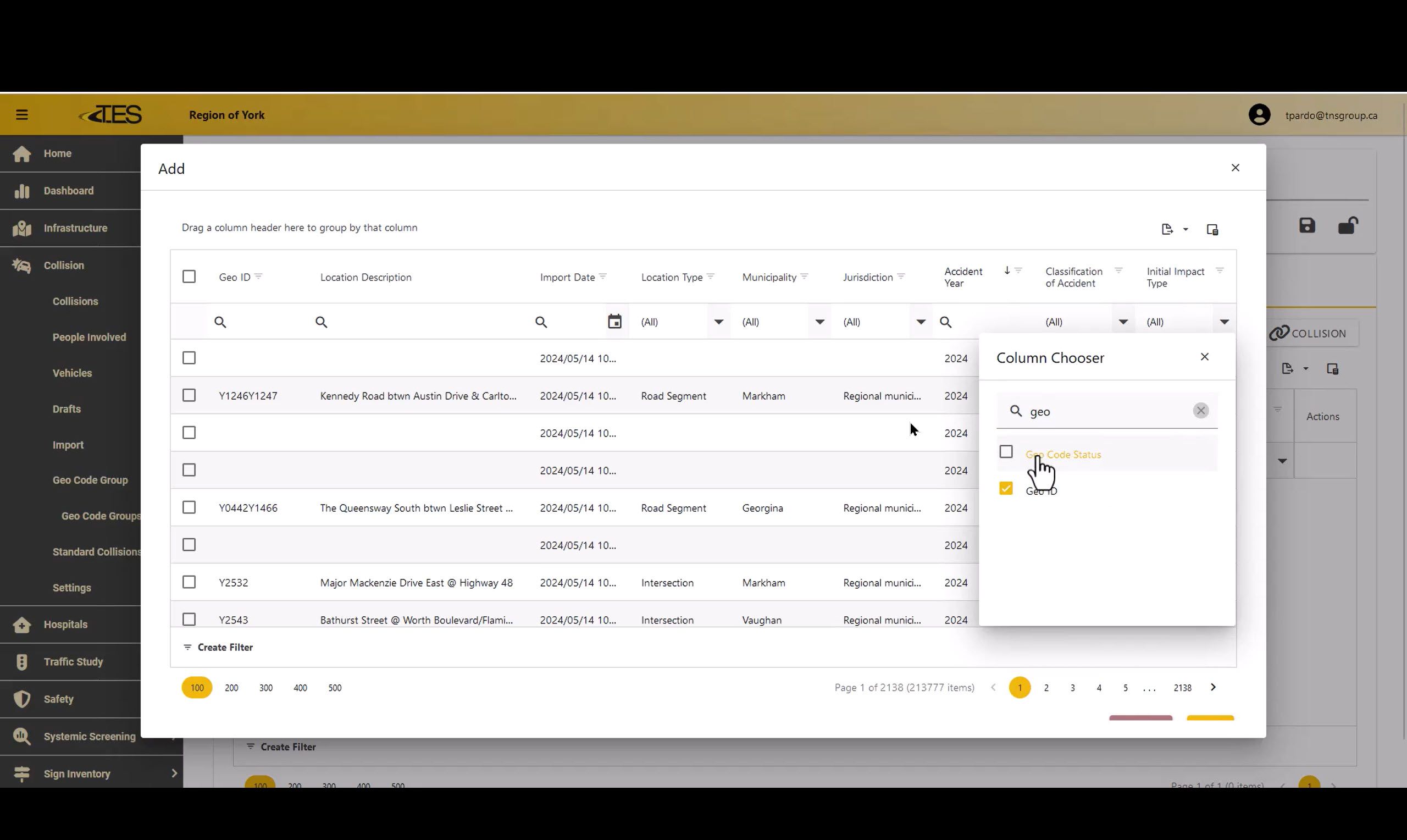 Select Geo Code Status from the list of available columns. This will display whether a collision is already geocoded or not.