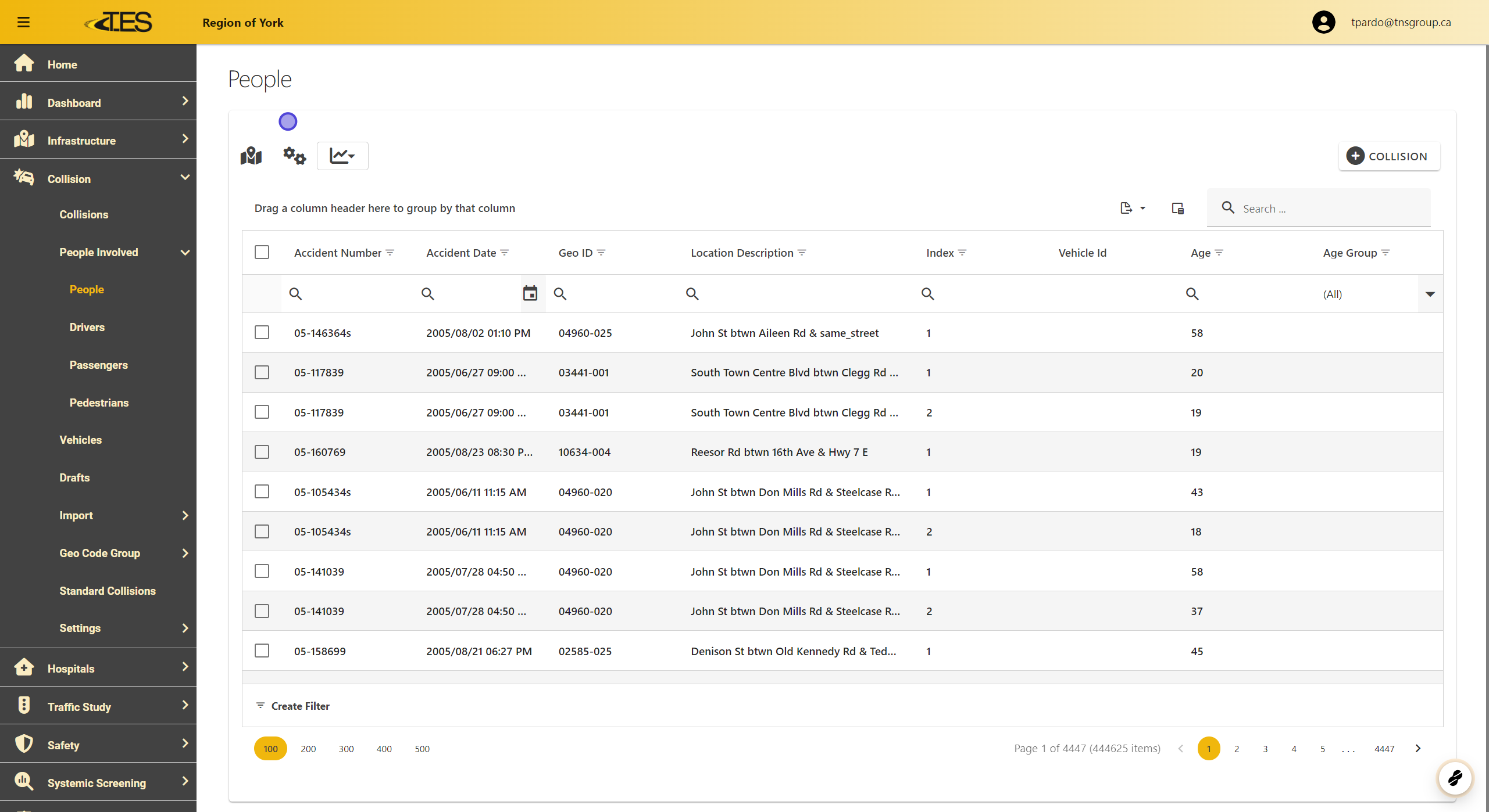 This tab contains comprehensive data grids with details about drivers, passengers, and pedestrians involved in collisions.
