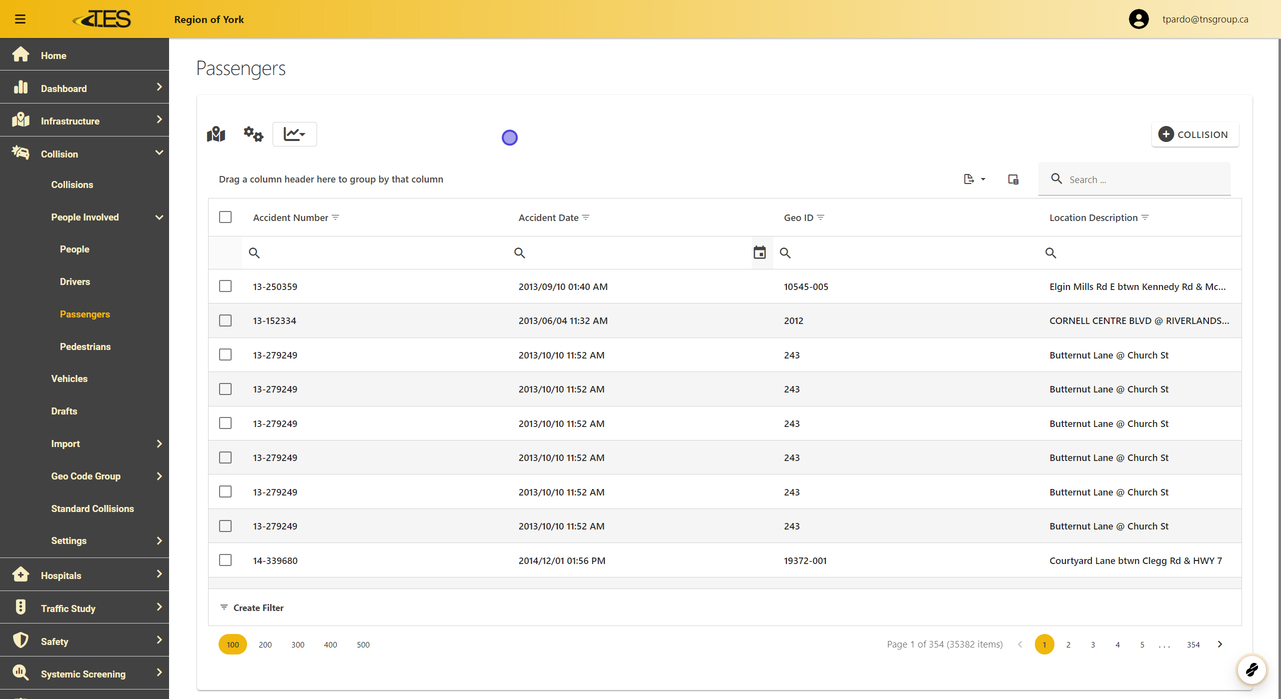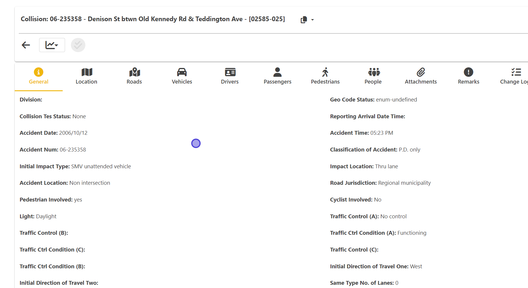 This tab contains comprehensive data grids with details about drivers, passengers, and pedestrians involved in collisions.