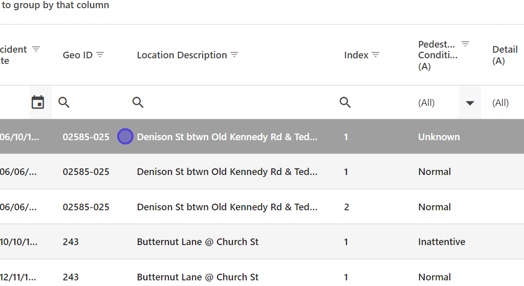 Click on any entry in the grid to open the detailed view of the collision the person was involved in.