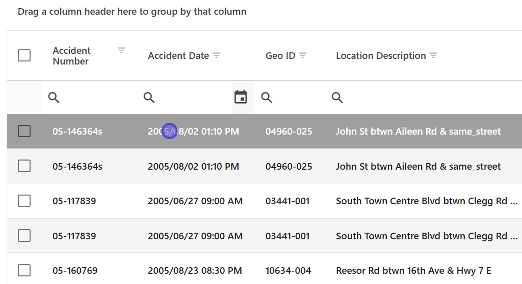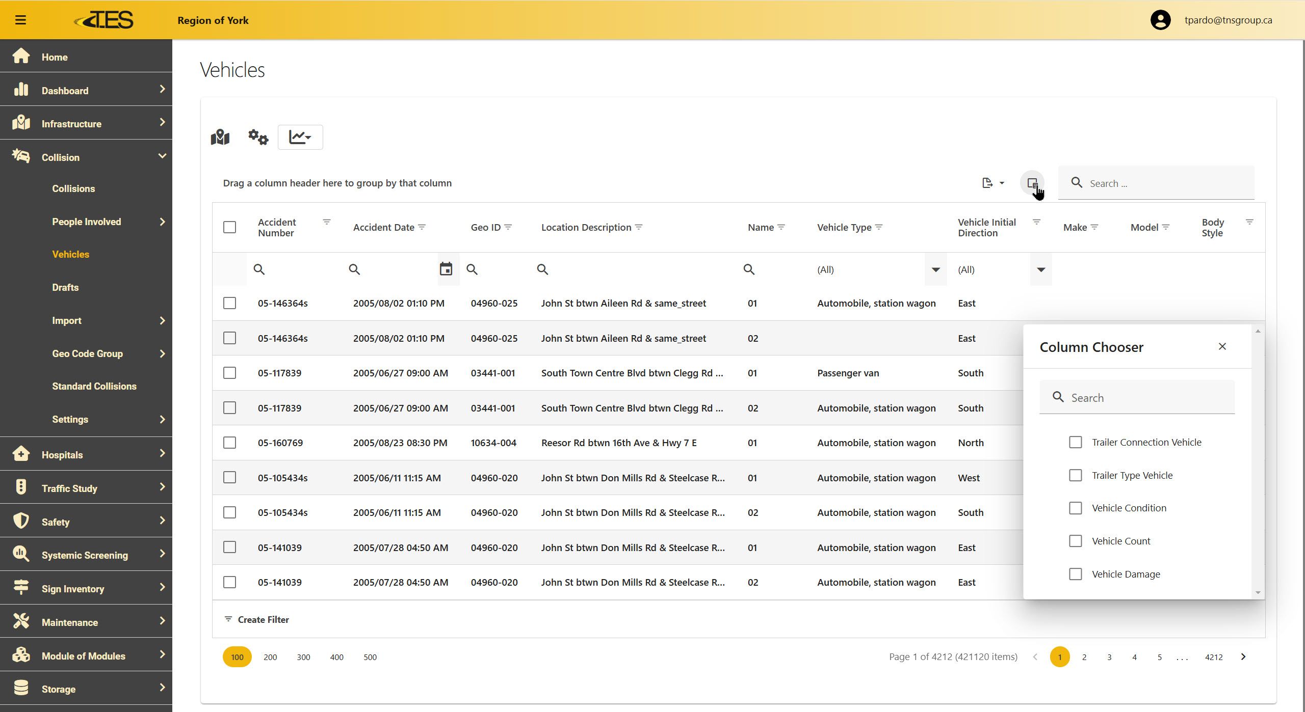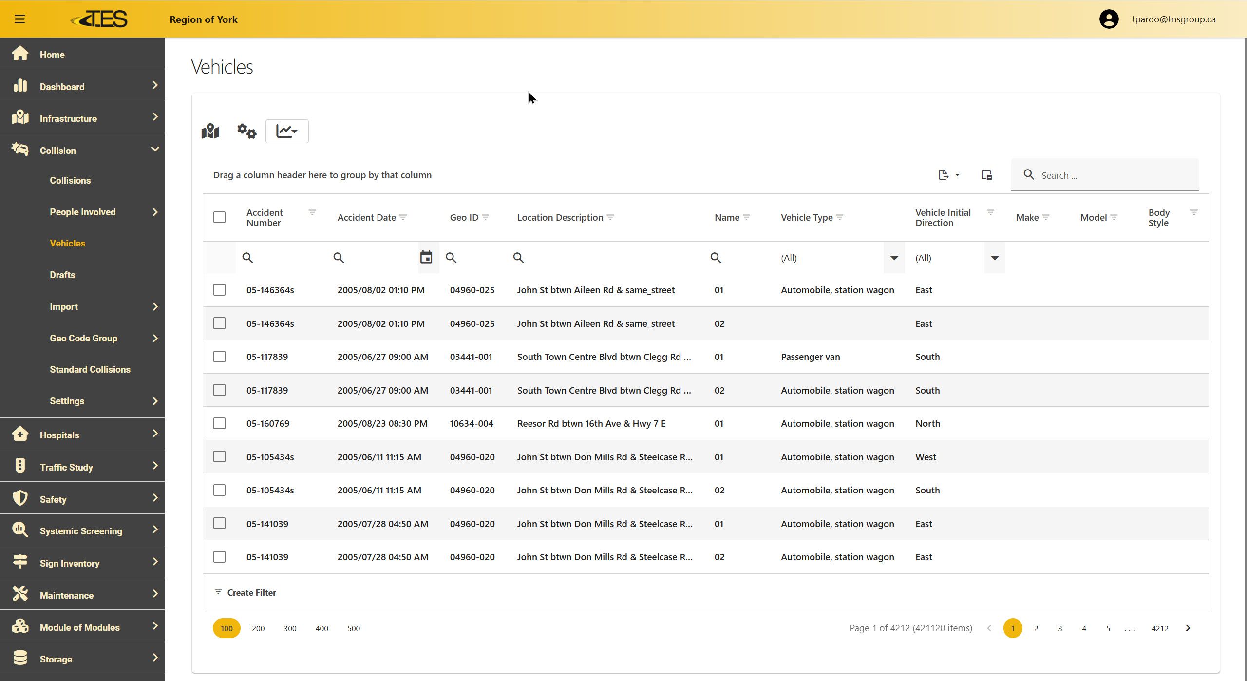 The Vehicles Module provides a data grid that contains detailed collision information focused on vehicles involved.