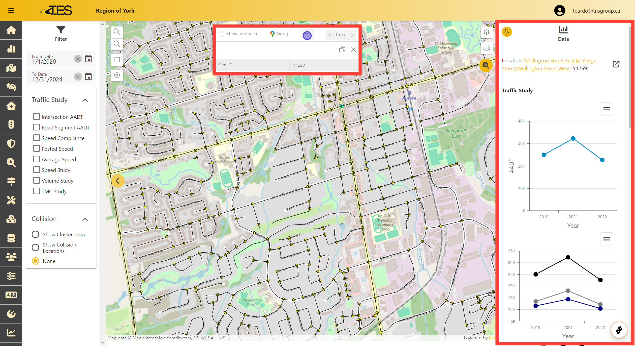 Graphs show trends in AADT values and other traffic metrics, enabling a deeper understanding of the selected location's traffic dynamics