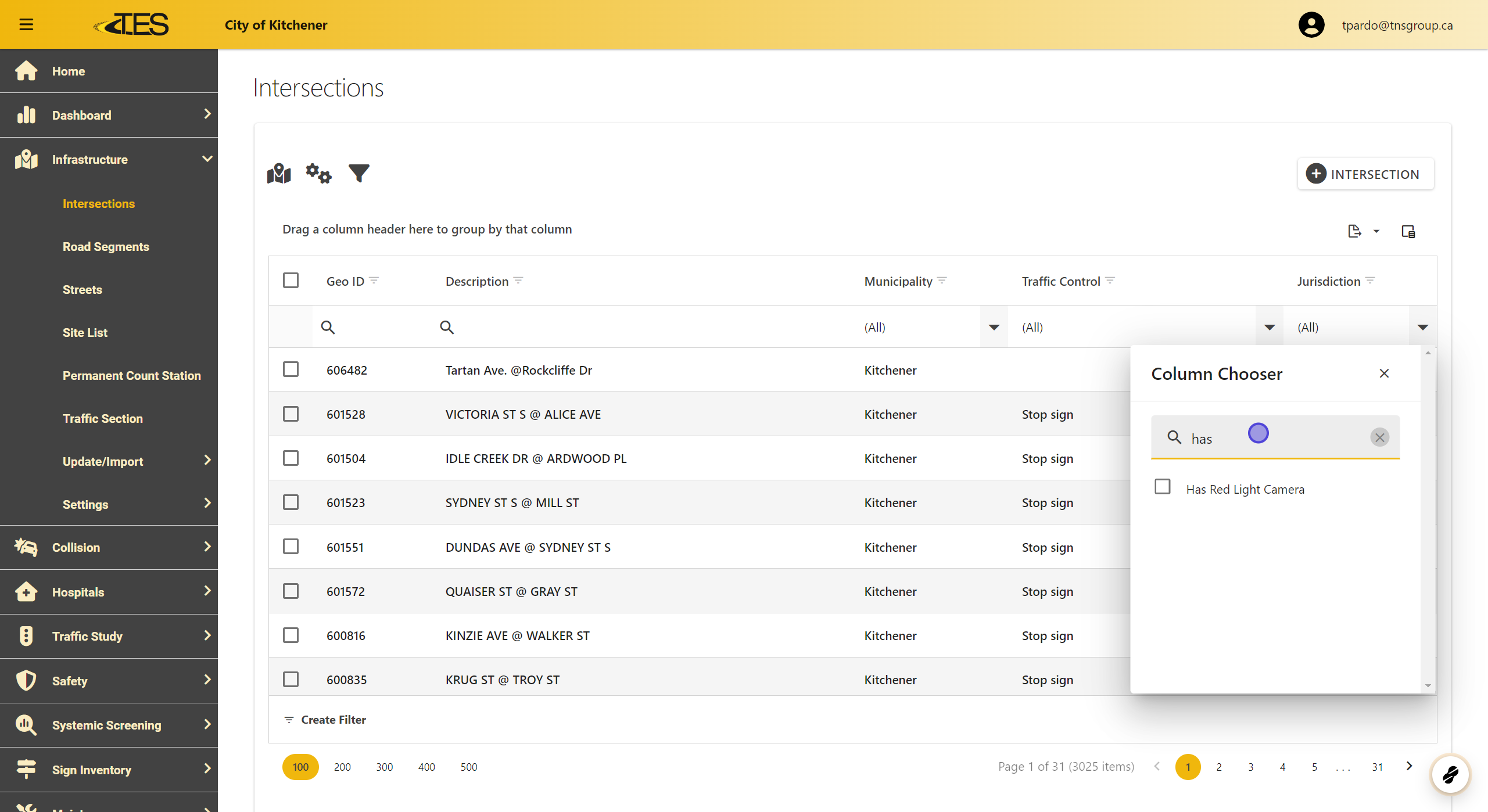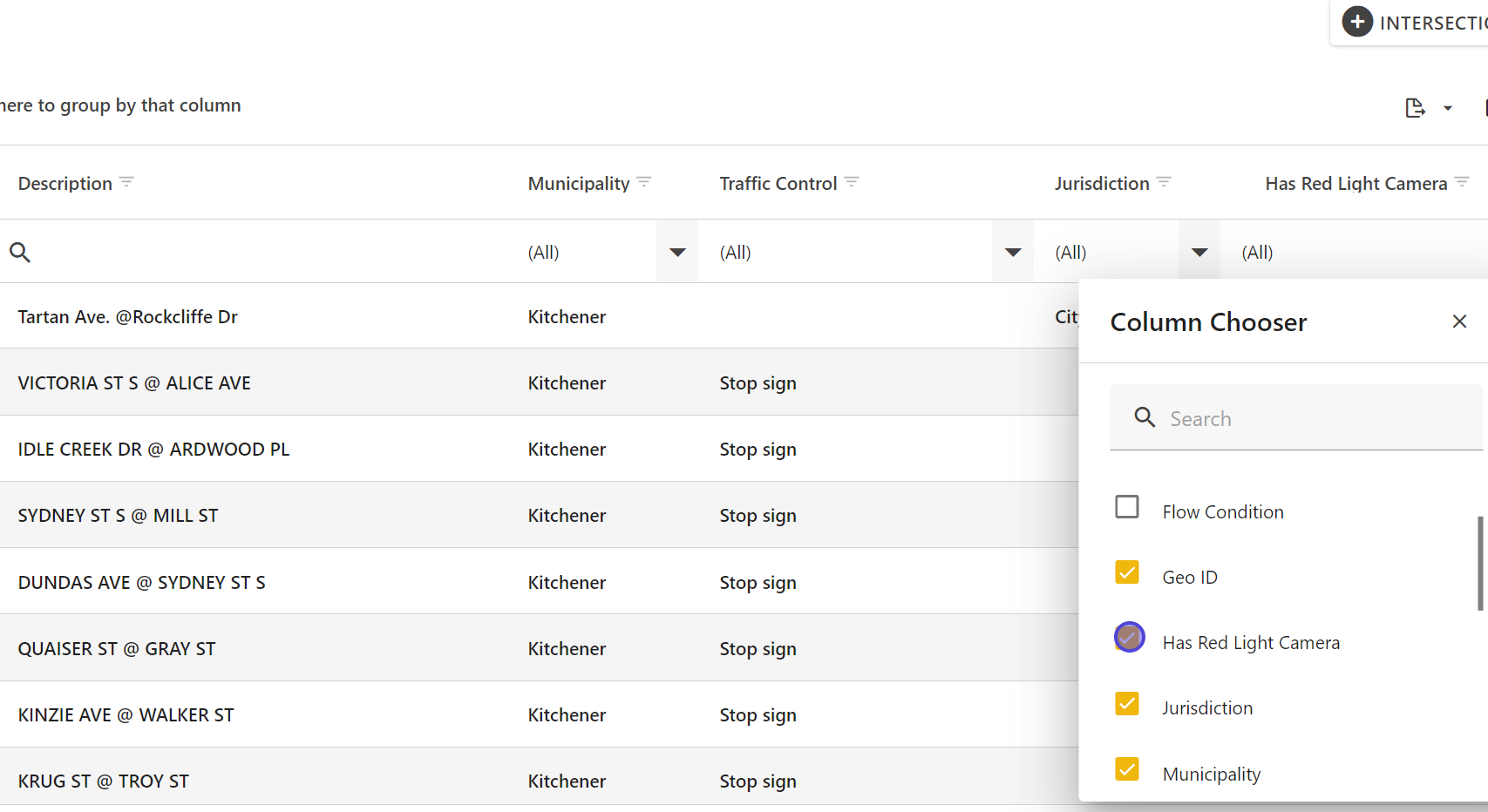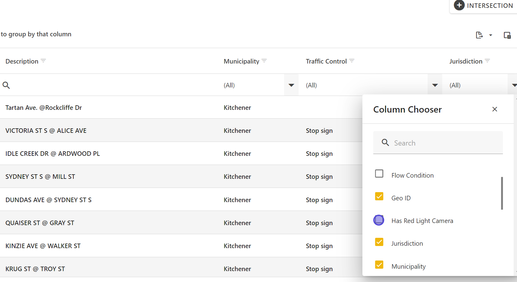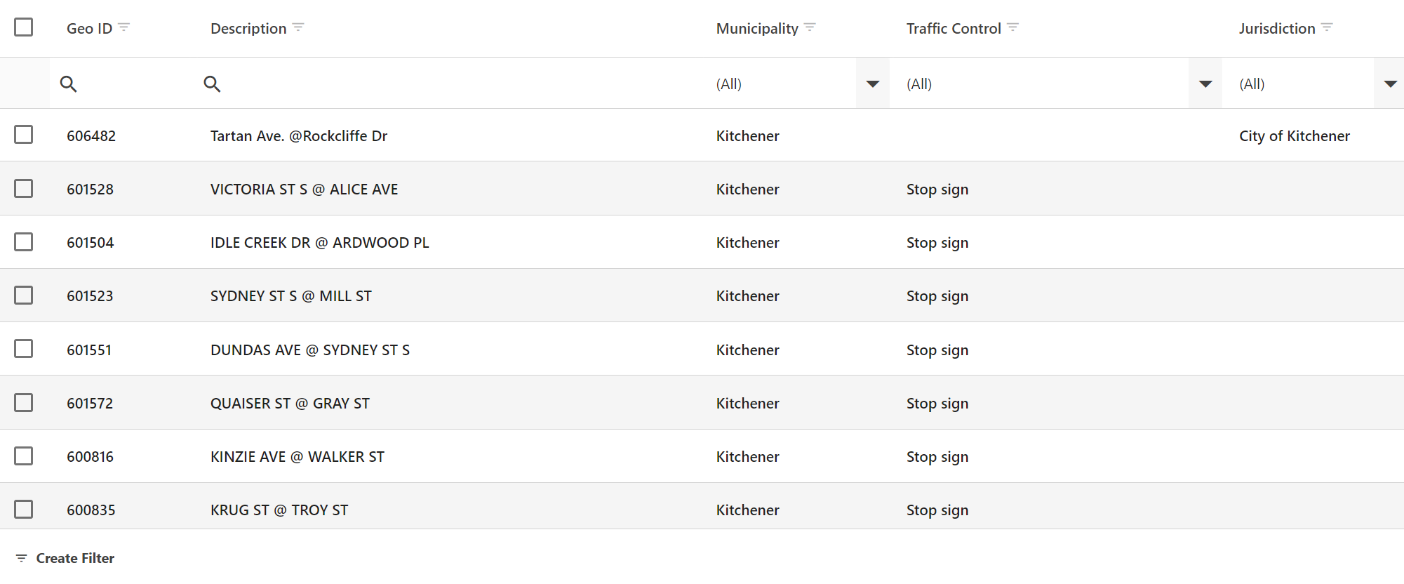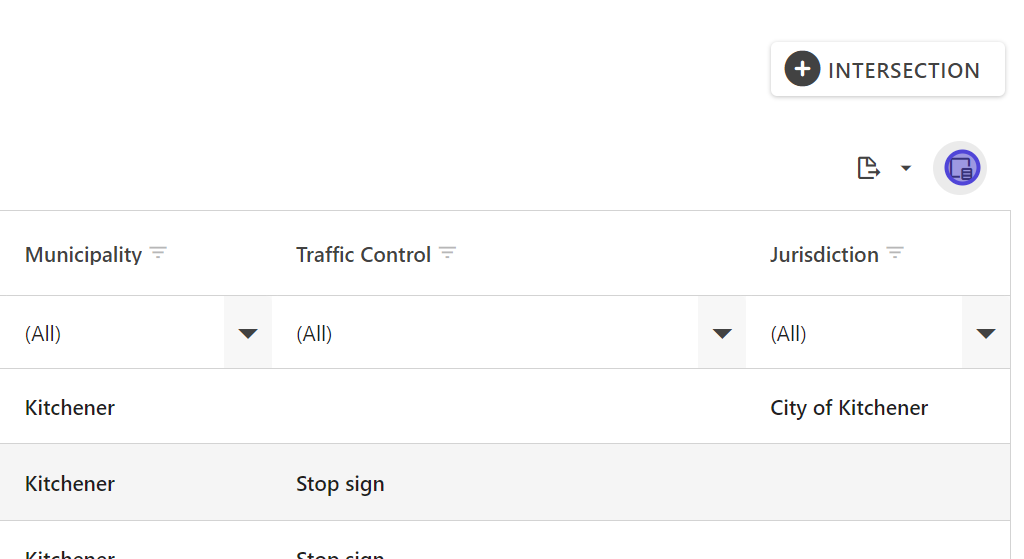 The grid contains multiple columns, such as Municipality , Traffic Control , and Jurisdiction .