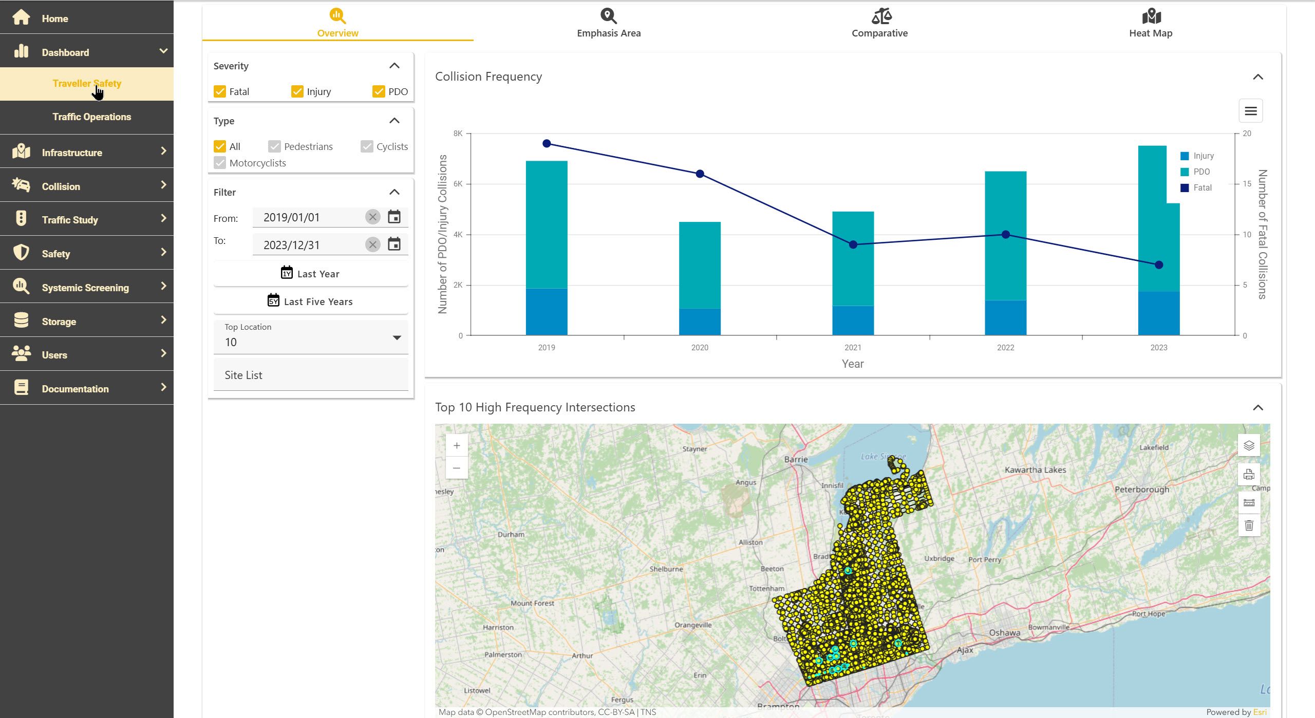 - The Traveller Safety module includes graphs, maps, and statistics on collision frequencies and high-risk intersections.