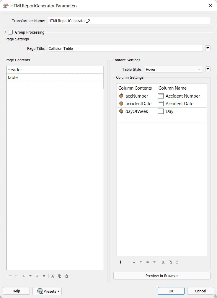 In the Column Settings, choose the Column Contents which basically are the attributes you want to show in the table. In our case, we want to show the AccNumber, dayOfWeek and accidentDate.