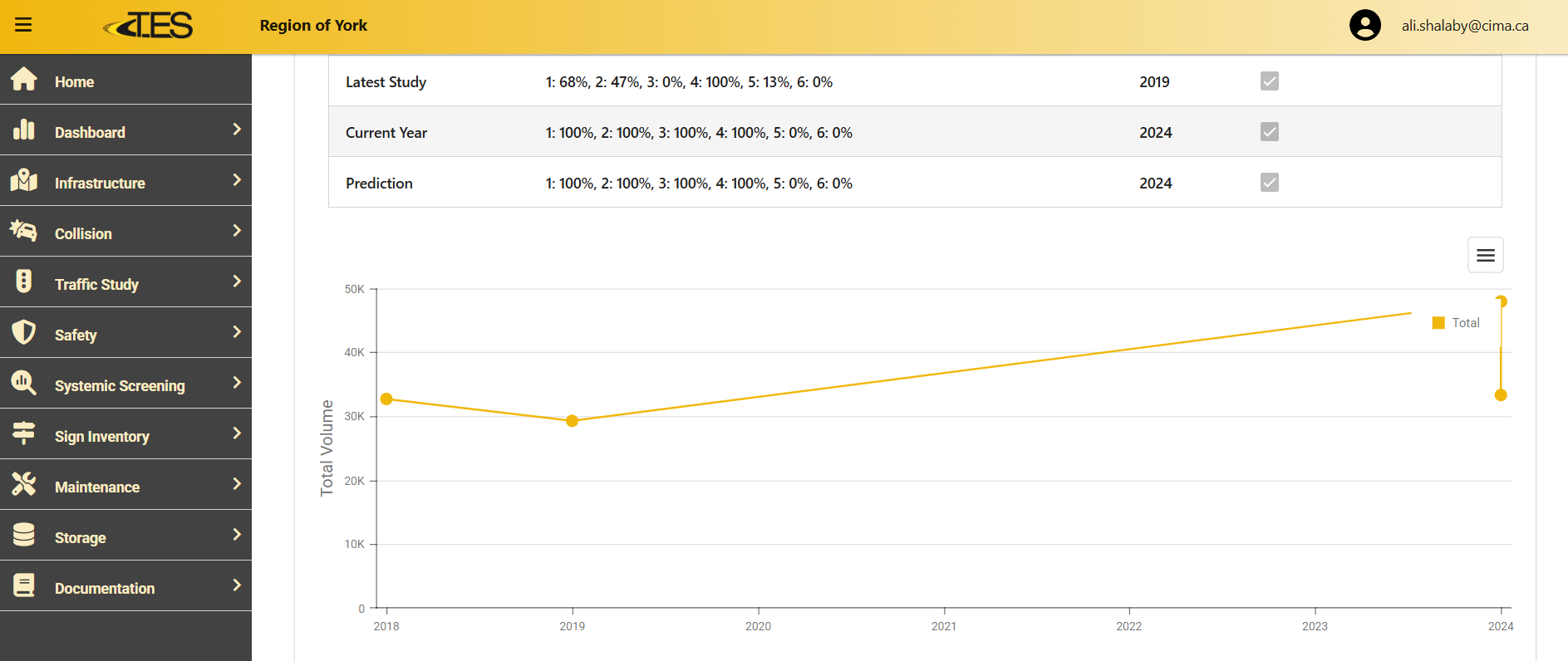 This documentation shows users how to view detailed results for a specific intersection, including traffic volumes, justification breakdowns, predictive trends, and supporting visualizations such as maps and graphs.