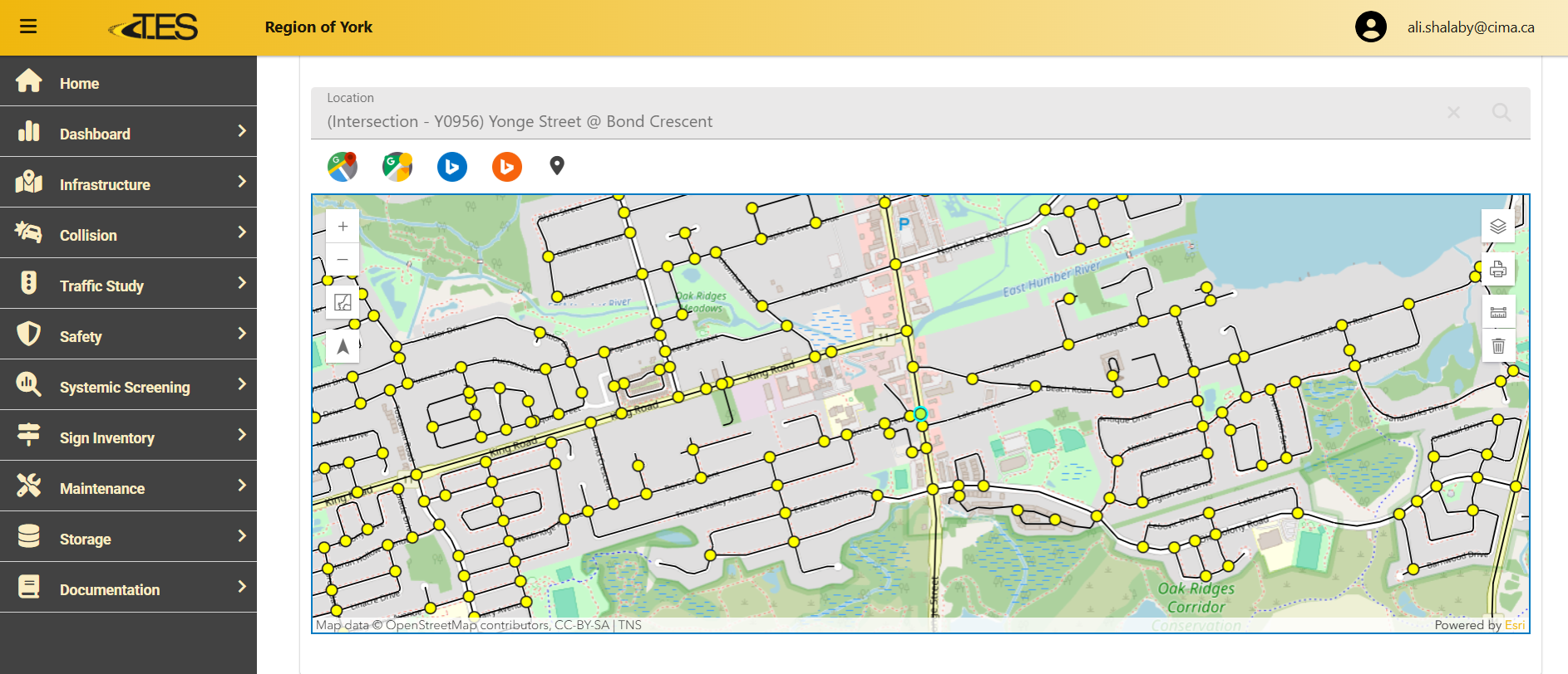 A GIS map centered on the selected intersection that is highlighted in blue.