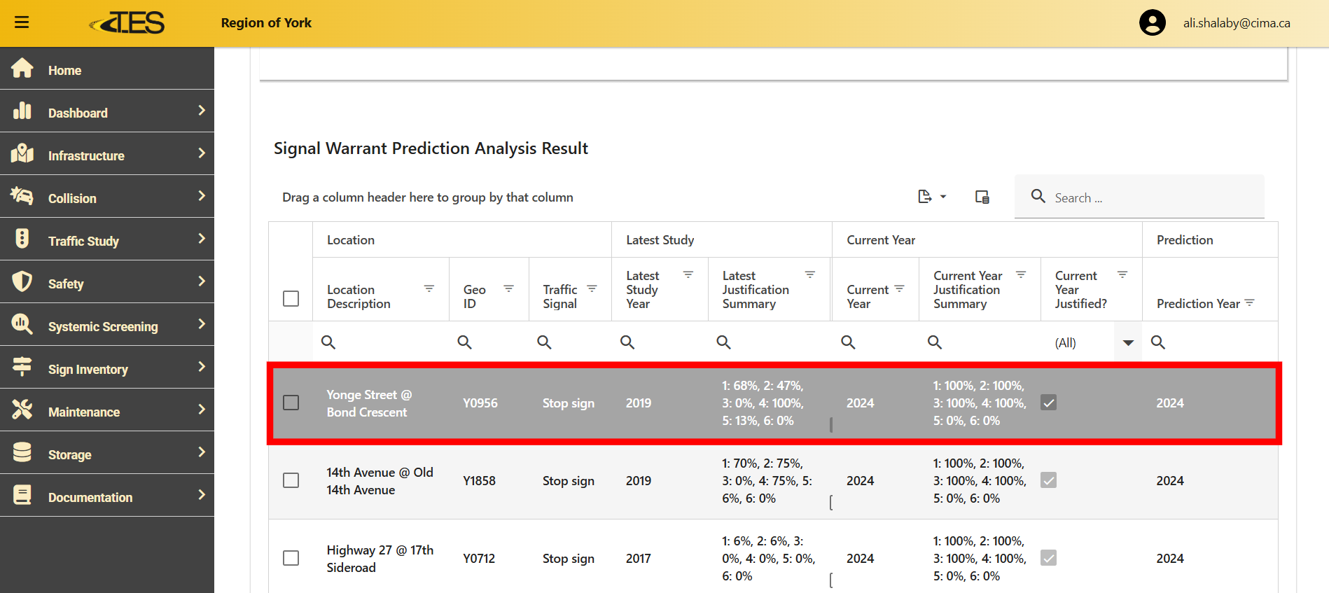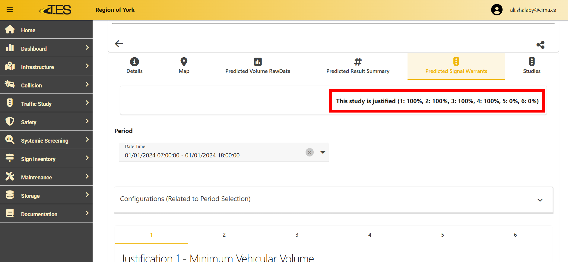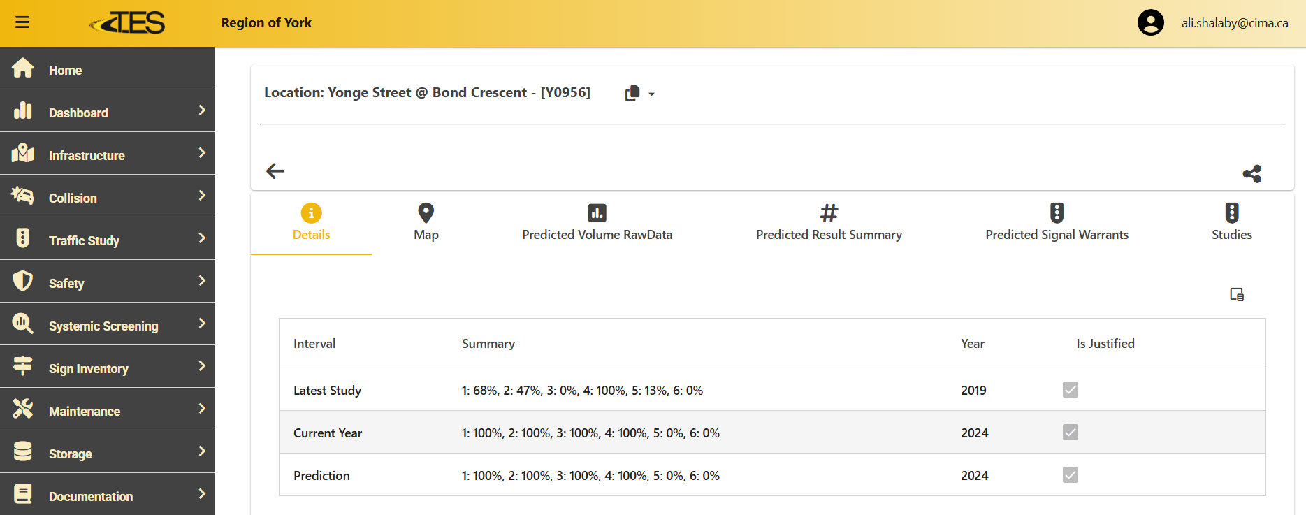 The Predicted Signal Warrants tab evaluates whether a traffic signal is warranted at the given location based on various justifications. These criteria are based on the justifications outlined in Book 12 of the Ontario Traffic Manual.