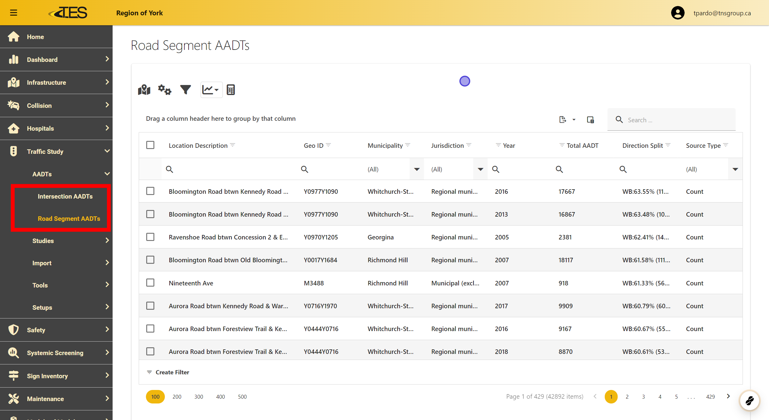Navigate to either Intersection or Road Segment AADTs module from the menu