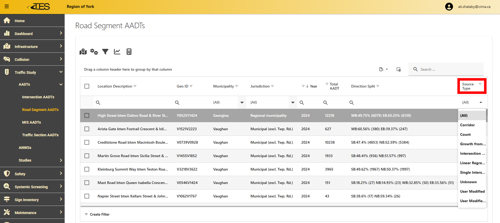 One of the fields for each road segment is Source Type. Users can view, filter, and group by AADT source type values and refer to these definitions: