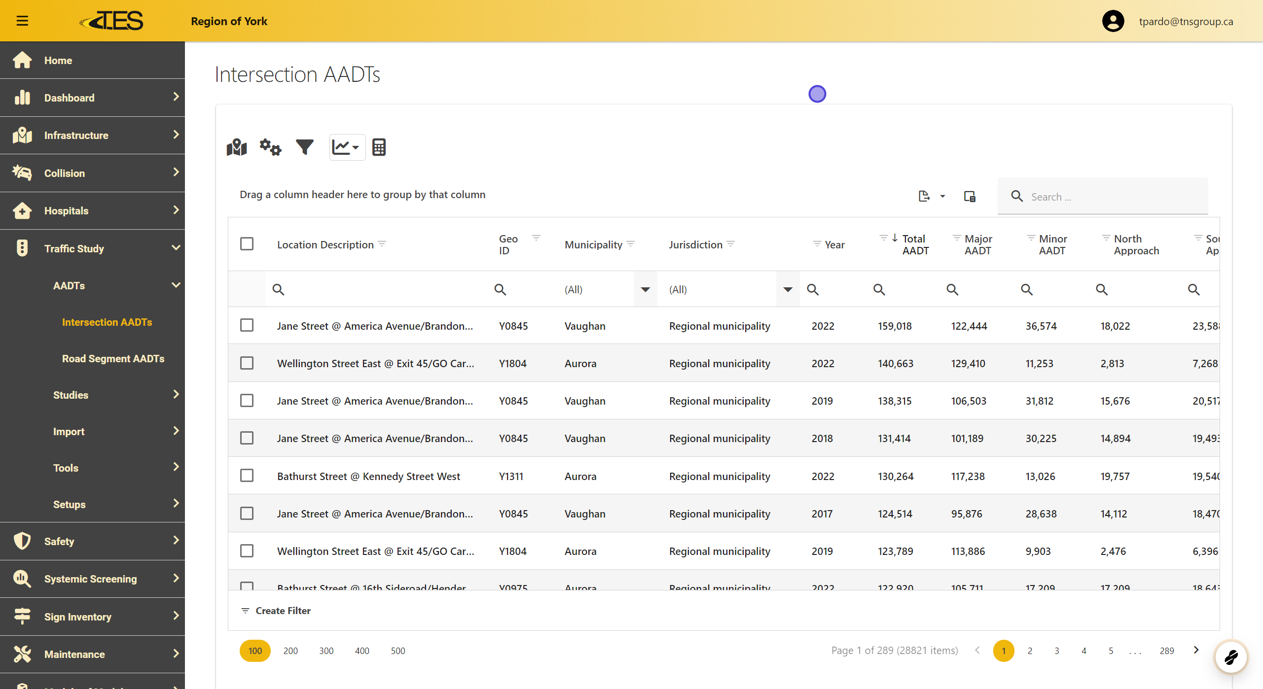 This documentation explains how to use the Intersections AADTs module in TES. Follow the steps below to view, edit, and utilize data related to Average Annual Daily Traffic (AADT) at intersections.