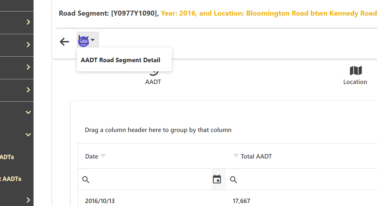 Select the row of the specific road segment AADT record you want to view by clicking on it in the data grid.
