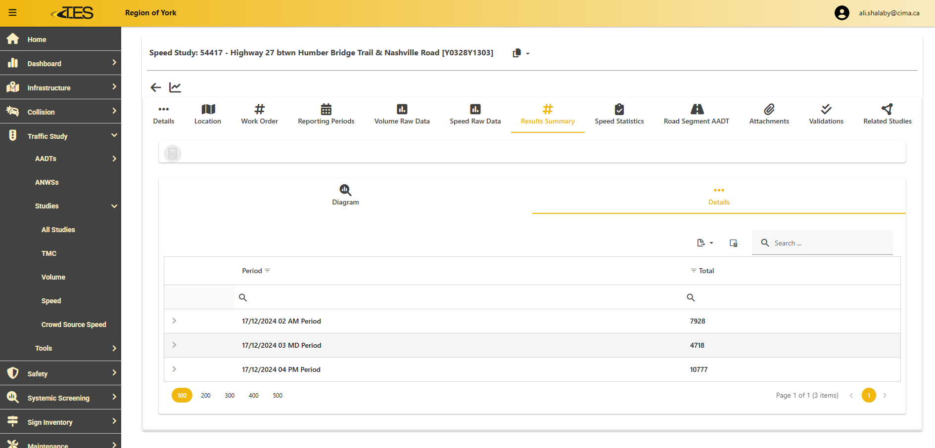 In this tab, you will see a data grid displaying all the periods within the study and their corresponding total AADT.