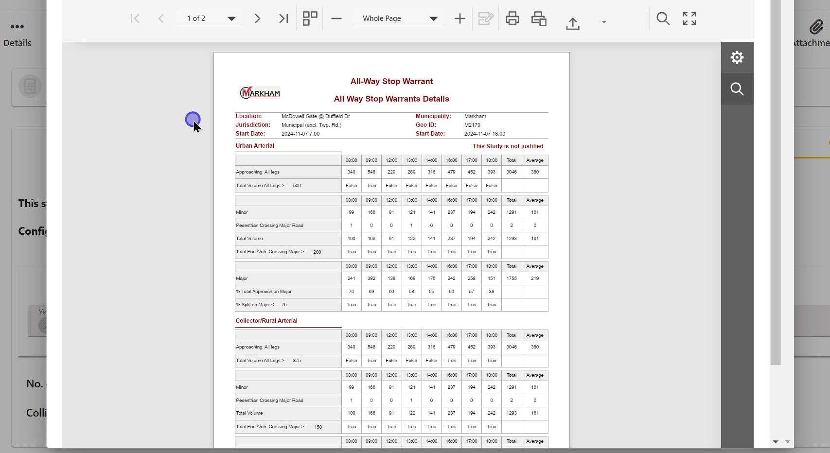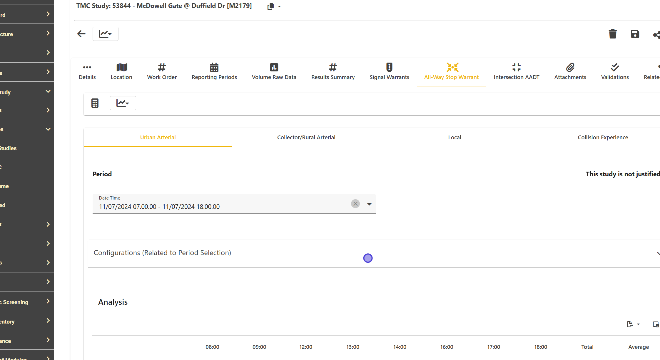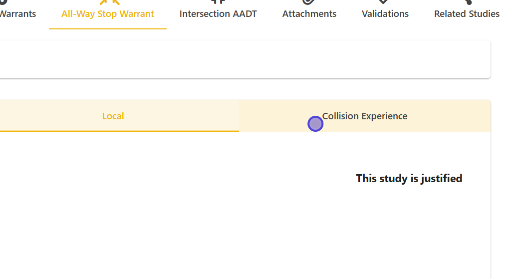 The All-Way Stop Warrants tab provides justifications for whether a location qualifies for an all-way stop.