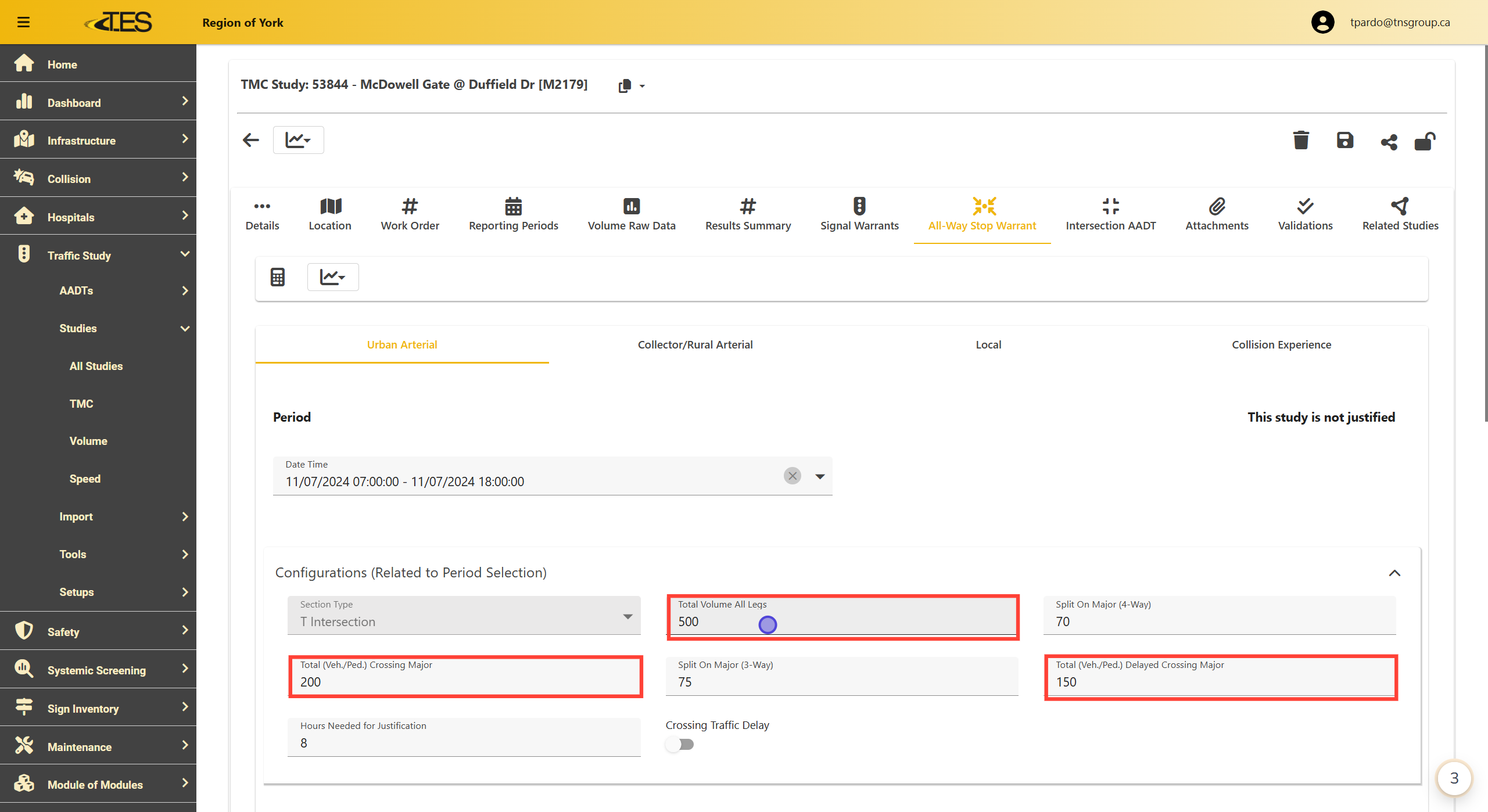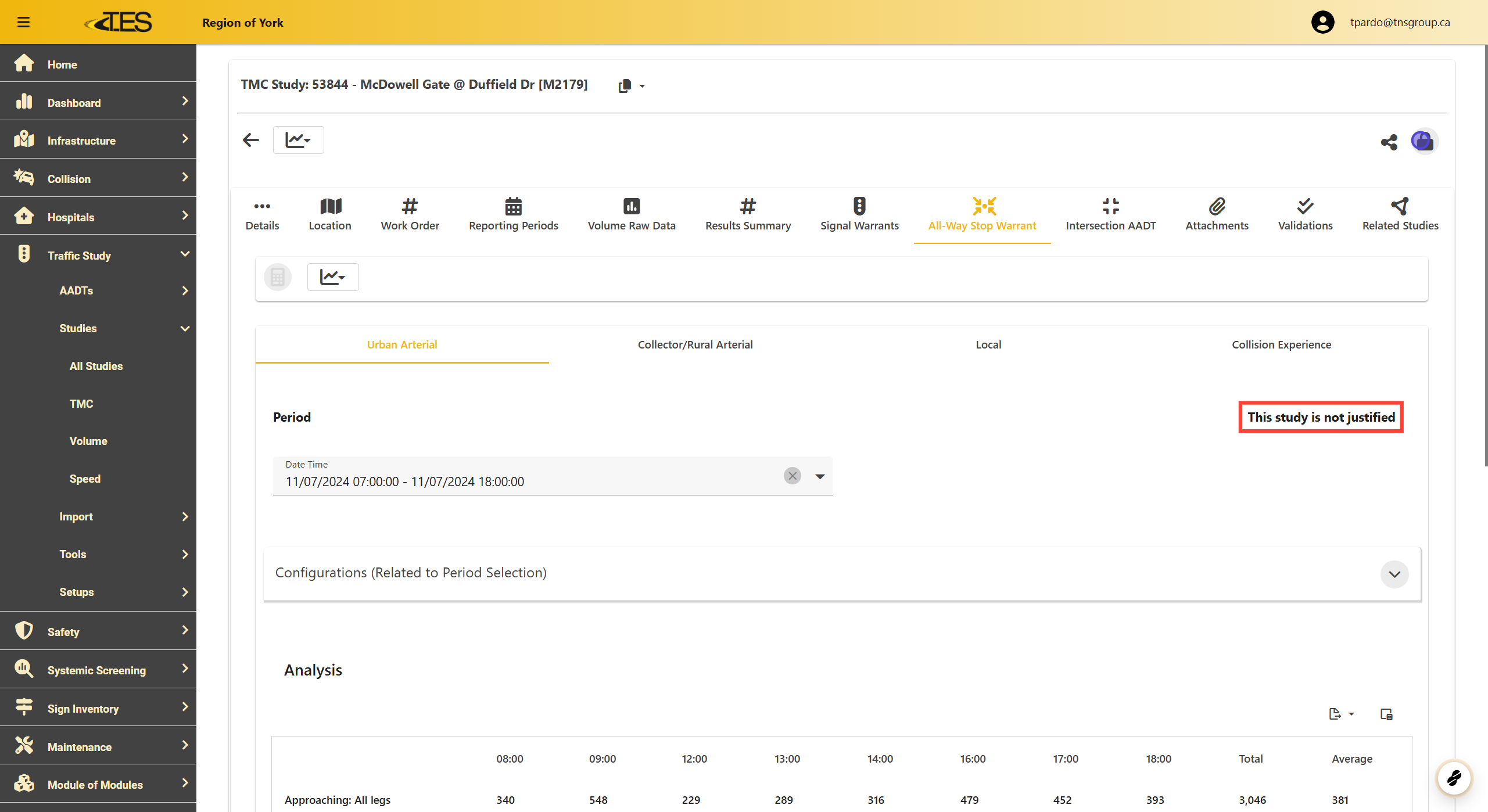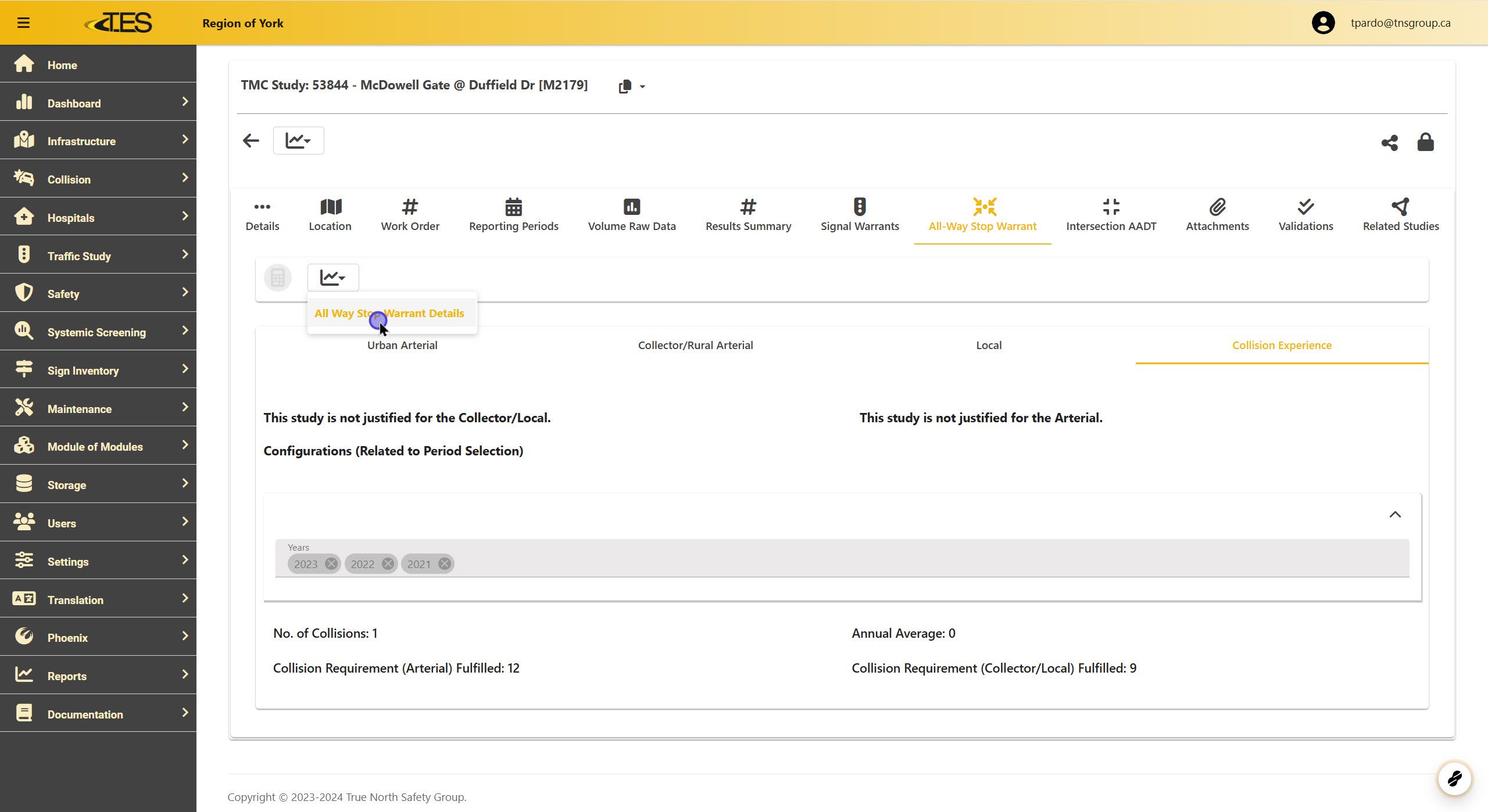 The All-Way Stop Warrants tab provides justifications for whether a location qualifies for an all-way stop.
