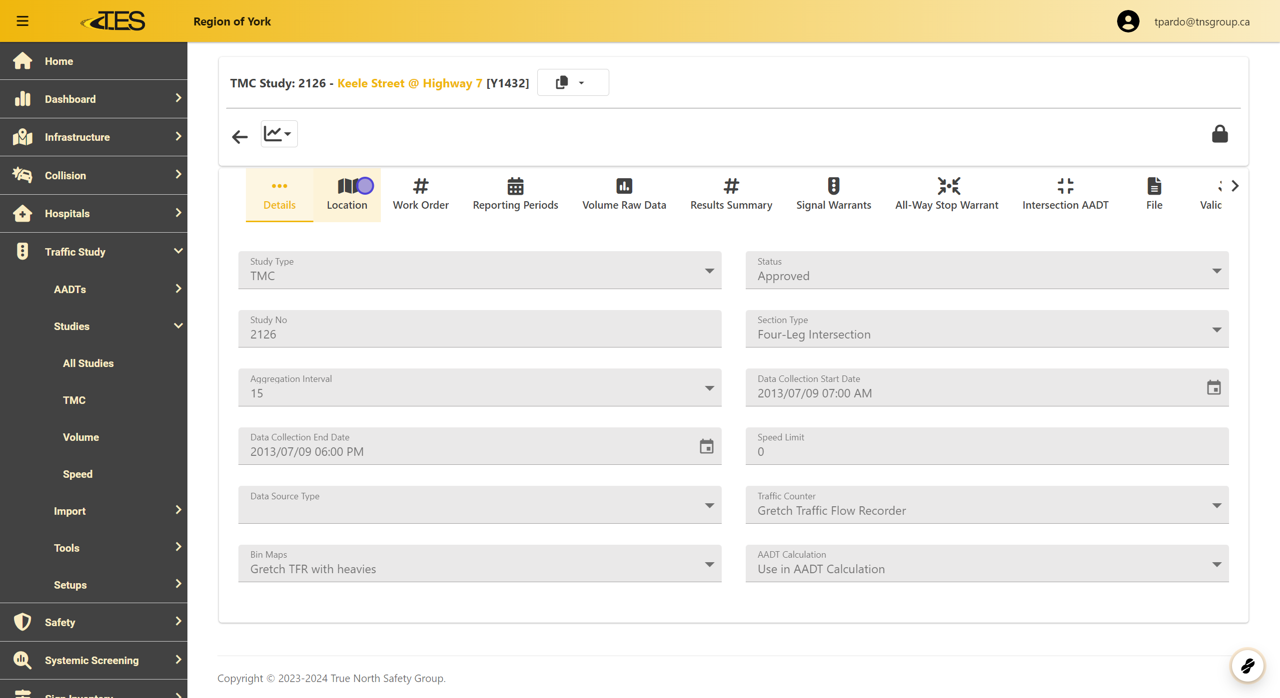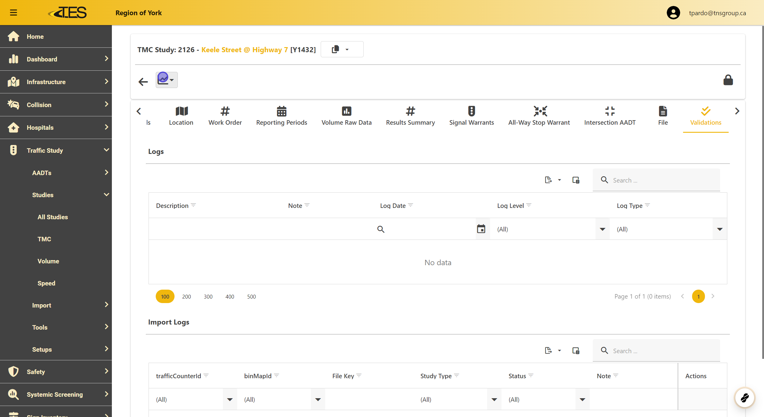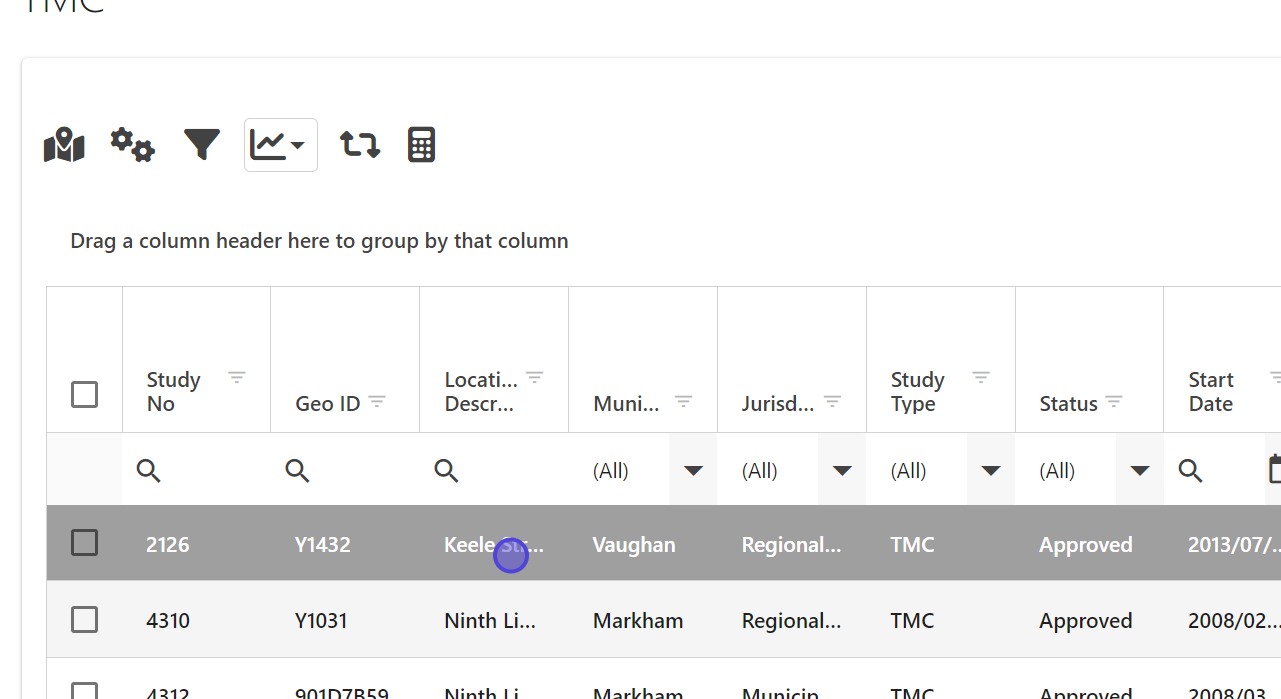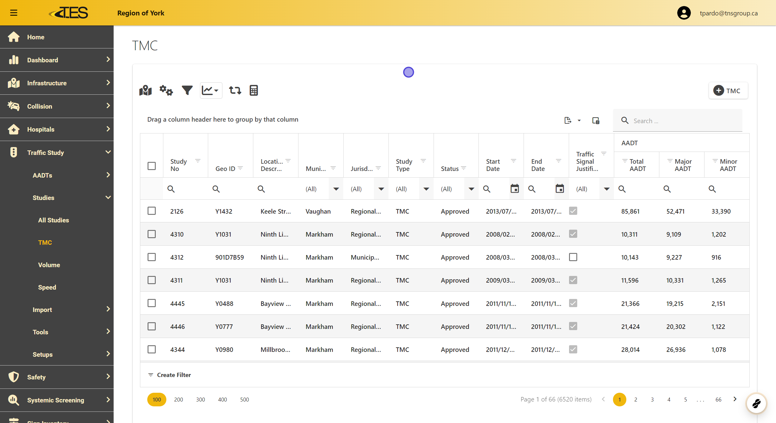 Navigate to the TMC Studies section from the TES dashboard. This module provides a comprehensive grid of all TMC studies (Traffic Movement Counts) in your jurisdiction. The grid includes columns such as: