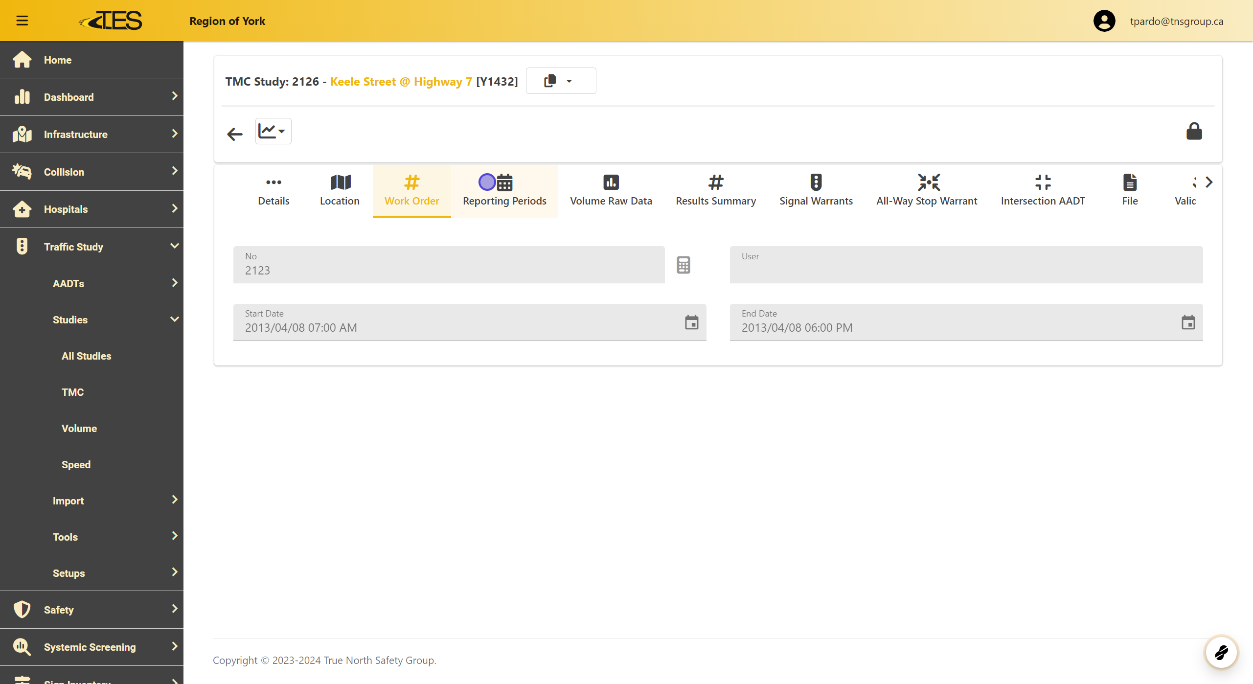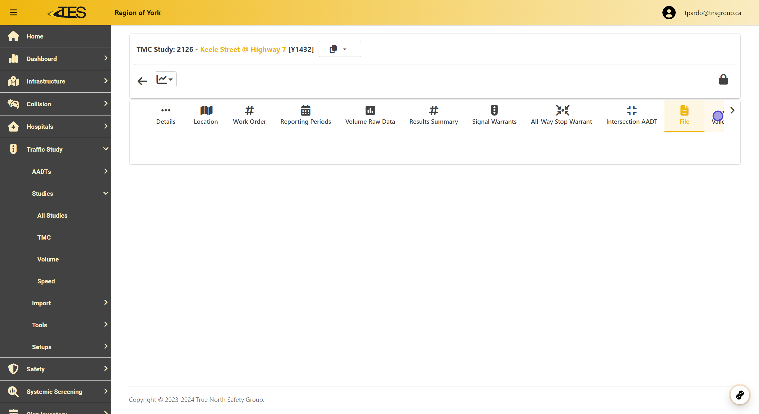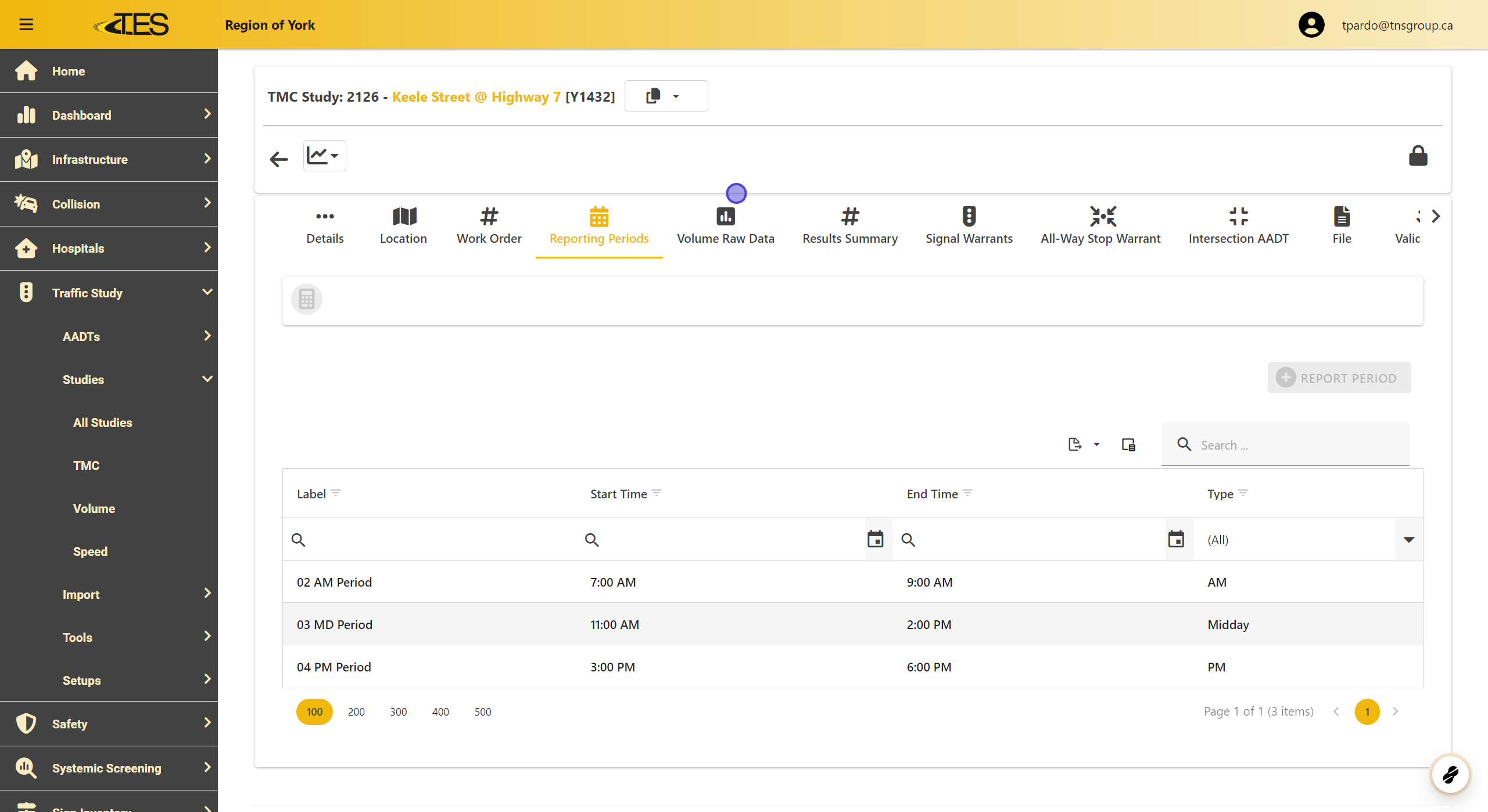 Navigate to the TMC Studies section from the TES dashboard. This module provides a comprehensive grid of all TMC studies (Traffic Movement Counts) in your jurisdiction. The grid includes columns such as: