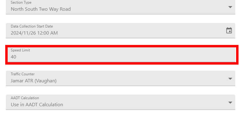 The speed limit field records the legal speed limit for the location where the study was conducted.
