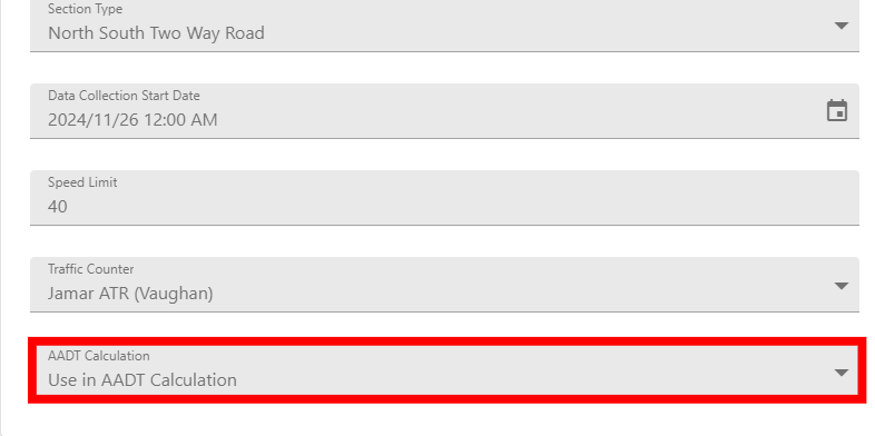 This field determines whether the study is used in the Average Annual Daily Traffic (AADT) calculations. By default, the study is included in AADT calculations, but you can set it to: