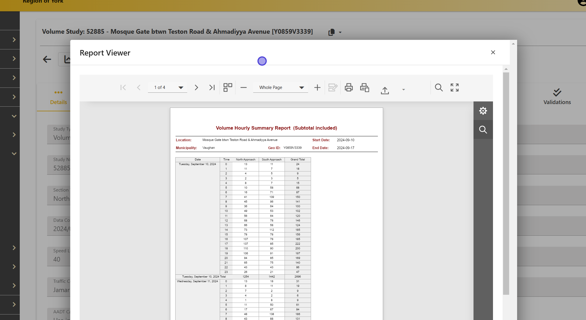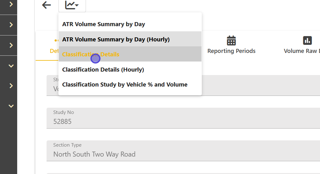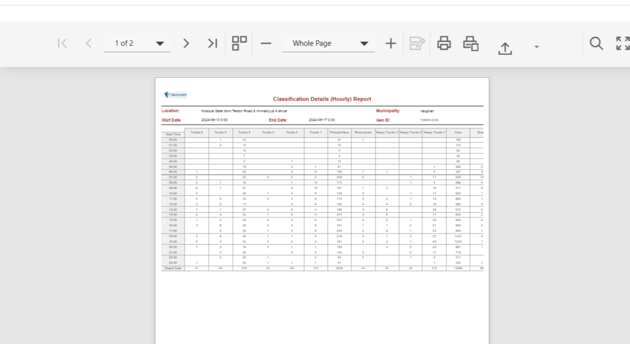 The Classification Details (Hourly) Report shows the volume of all the vehicles classified for the study by hour.