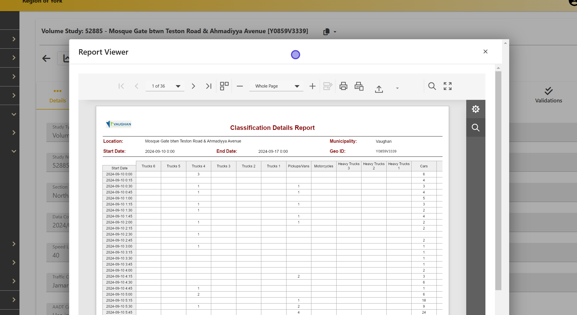 The Classification Details Report shows the volume of vehicles classified during the study in 15-minute intervals.
