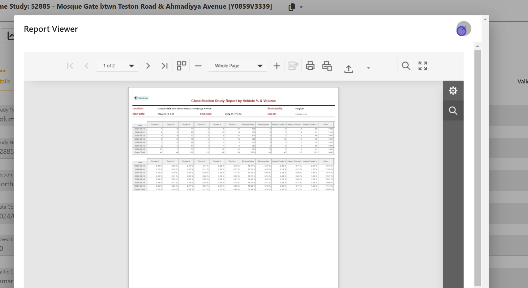 Classification Study by Vehicle % and Volume Report : Summarizes vehicle volumes and their percentages for each day.