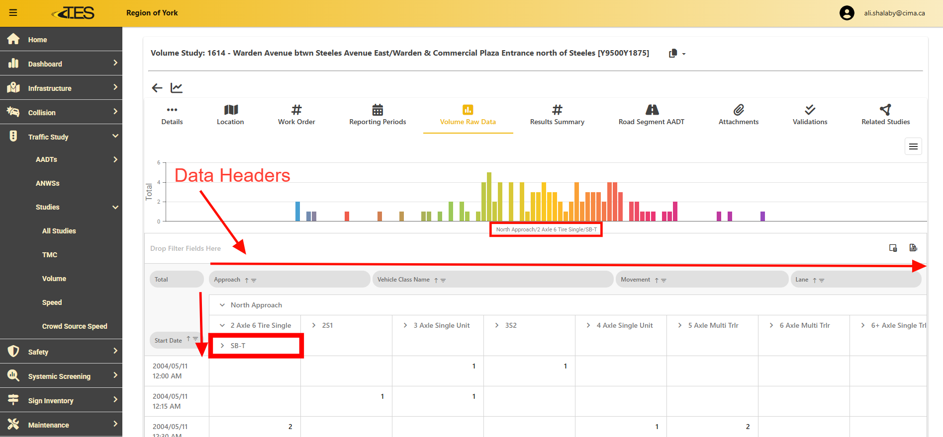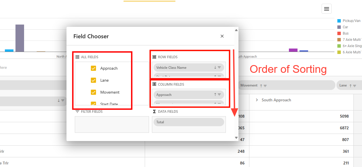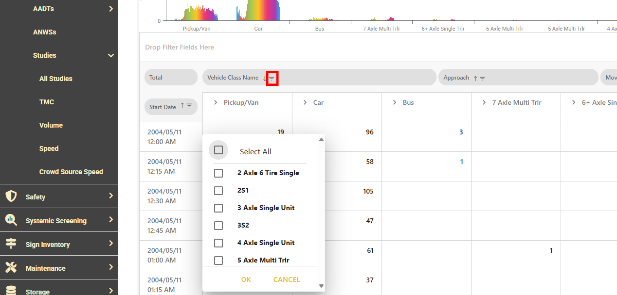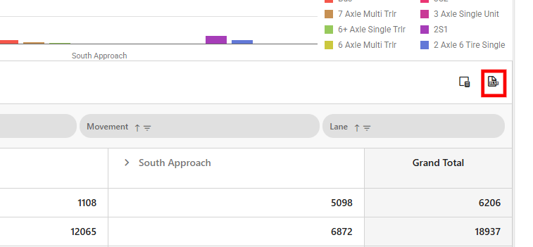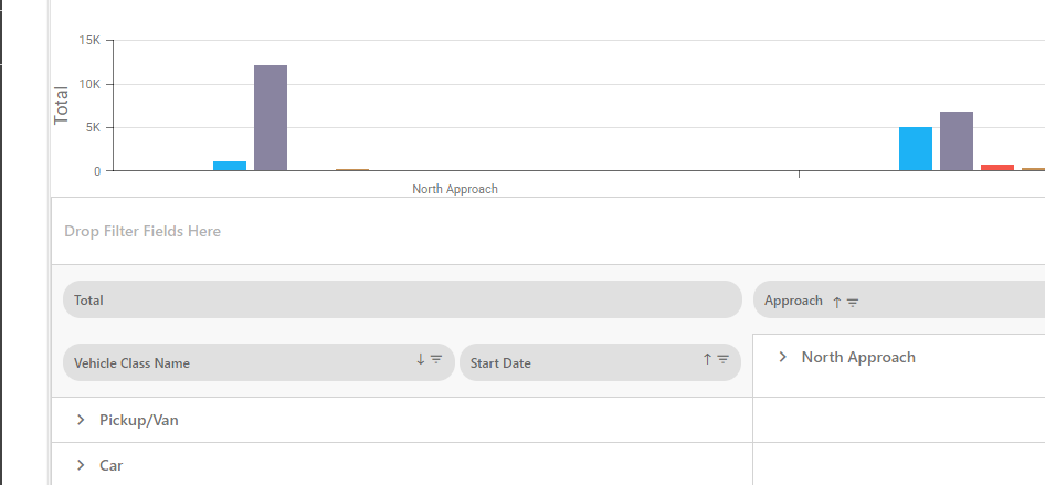 To customize your data view, drag the Vehicle Class Name header to the left of the Approach header in the table.