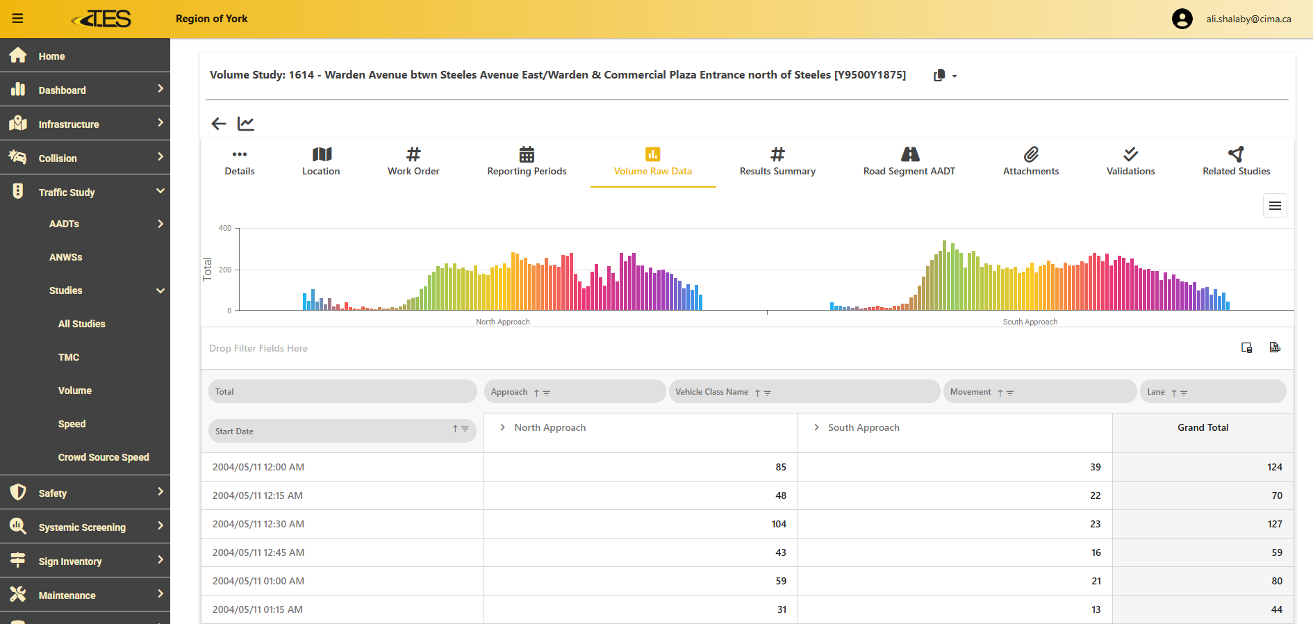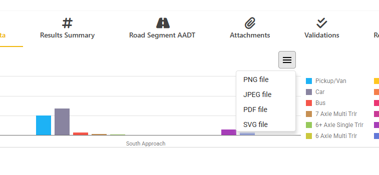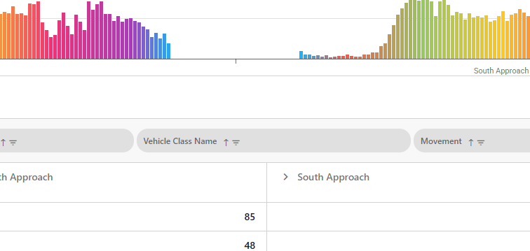 For example, clicking on a approach header (e.g., "North Approach") will expand groups to volume by vehicle for that approach. This will update the graph above.