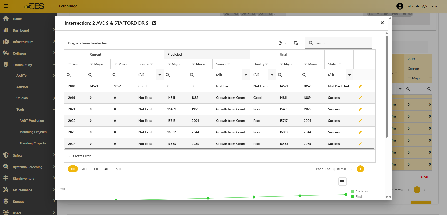 A graph displaying Current, Predicted, and Final AADT values over time will appear when scrolling down.