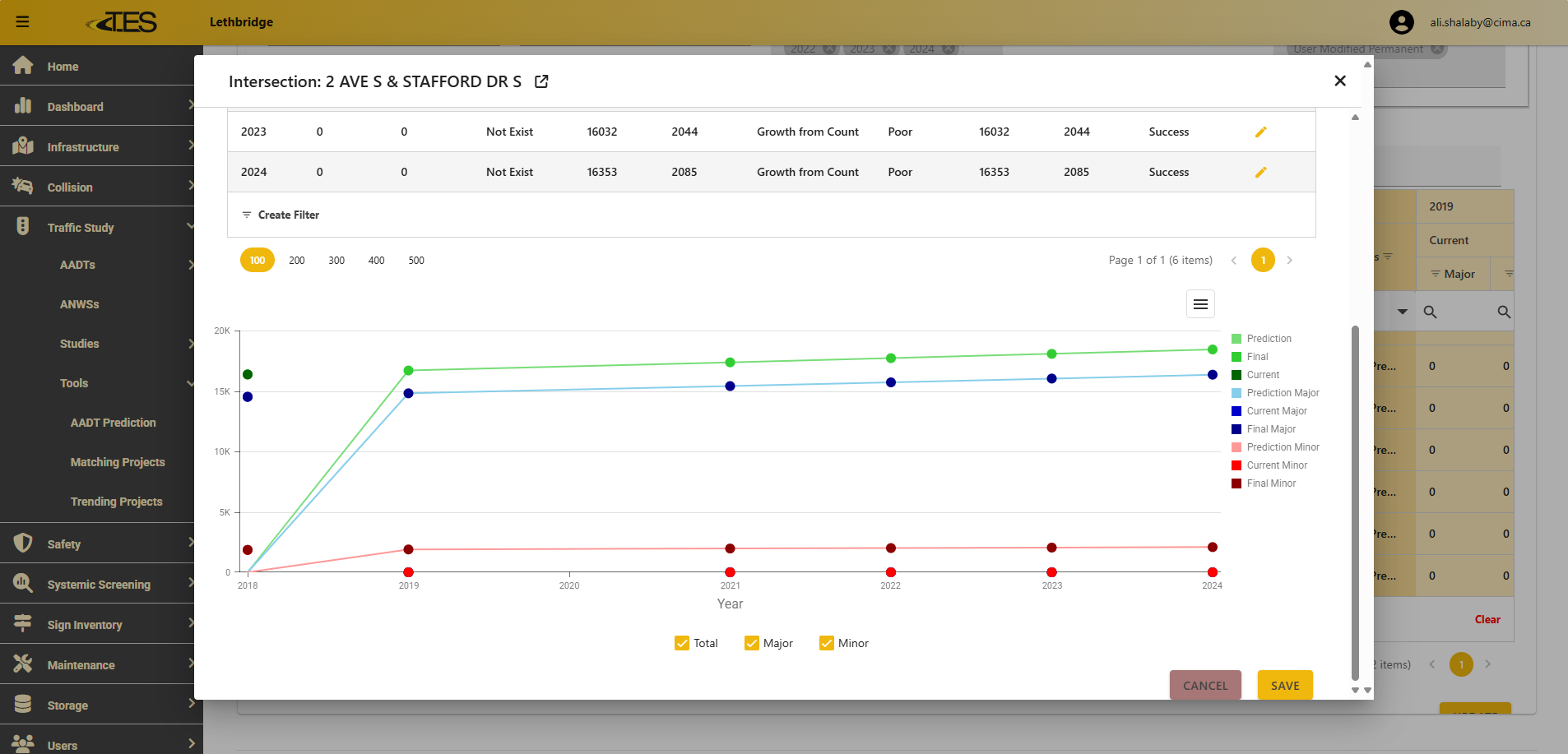 Note: If the current year's major and minor AADT values are populated, then the predicted major and minor AADT values will be 0 as they do not require prediction.