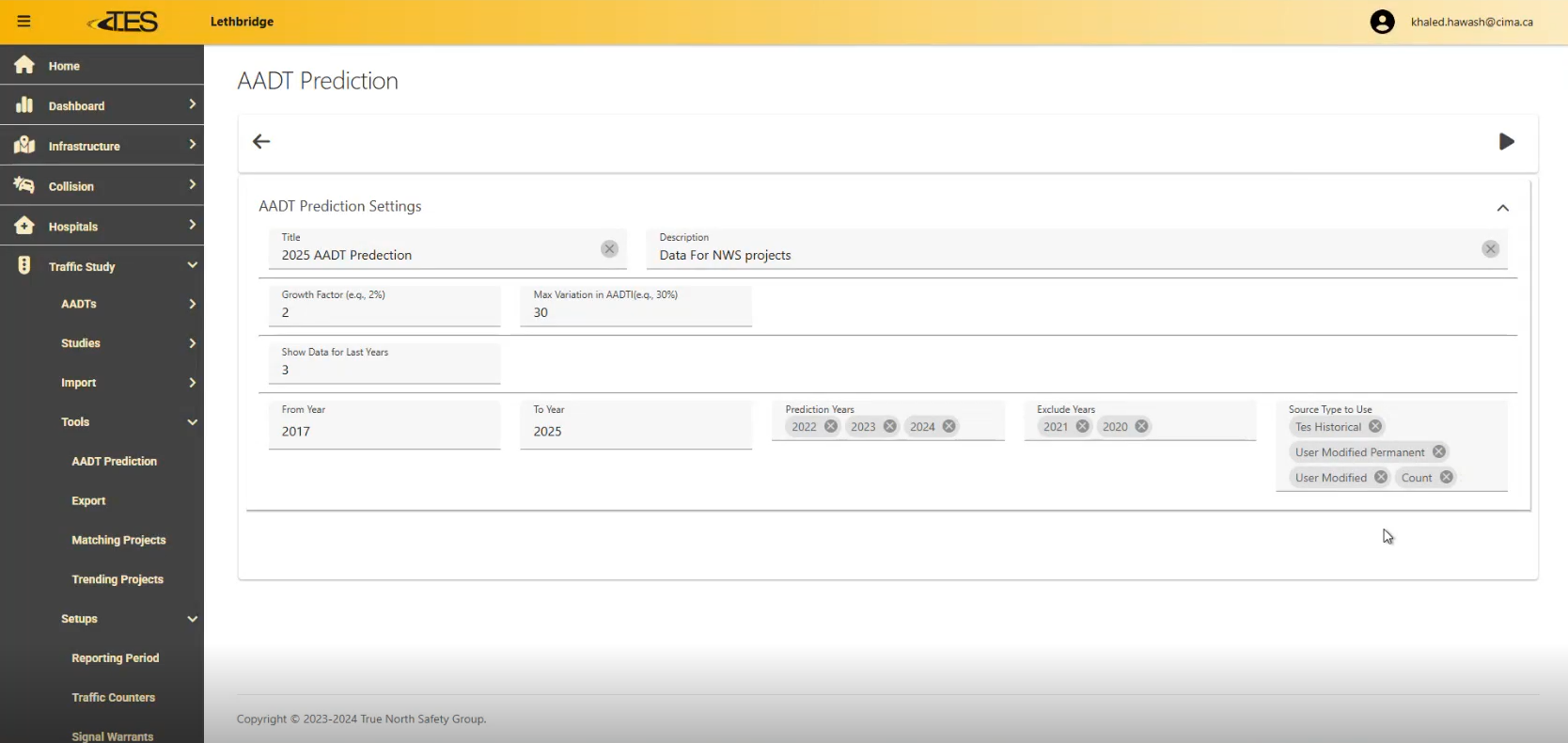 Prediction Years: Defines the future years for which AADT values will be predicted.